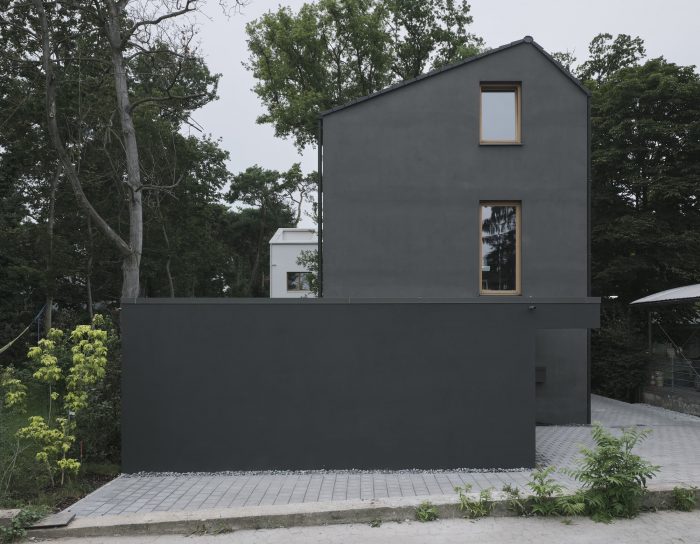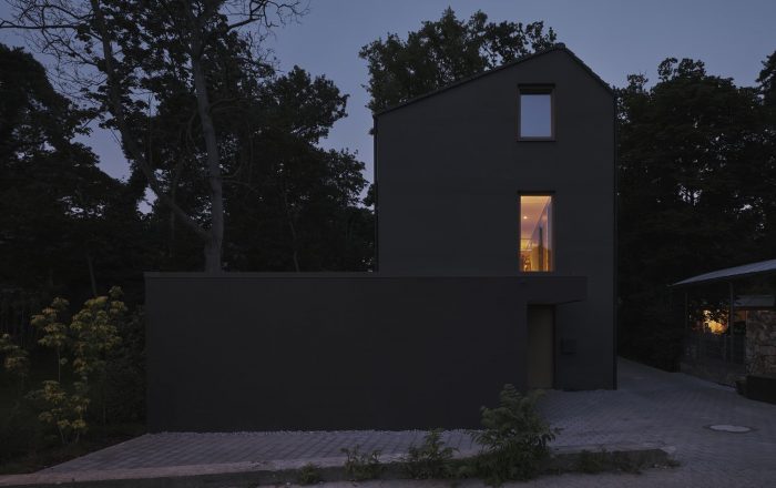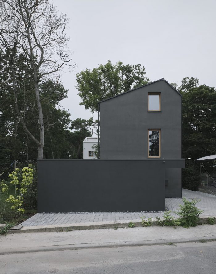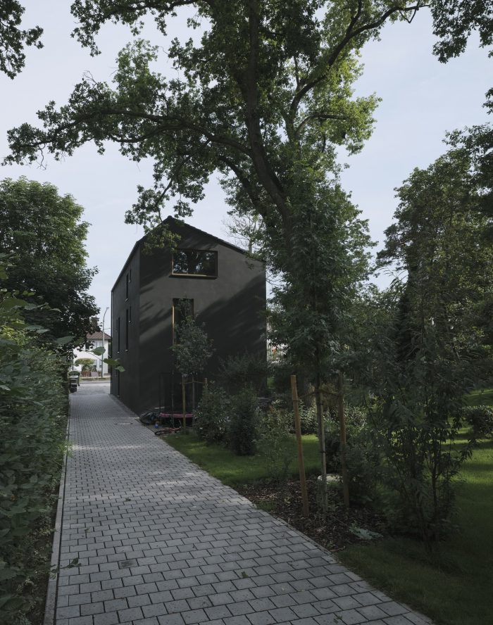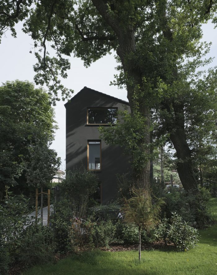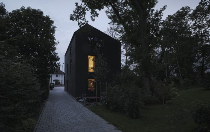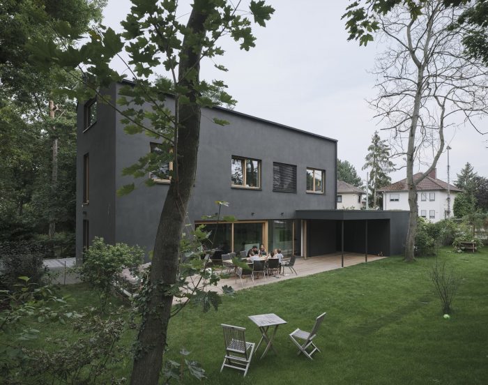 The “Black House” is part of an architectural ensemble of two residential buildings, located in a popular suburban uptown district in the city of Mainz. The admissible building density and the sloped roof shape were building requirements on the plot. The slim layout of the house enables a pleasant and generous use of the garden and totally respects the existing vegetation with its impressive old oaks and pine-trees.