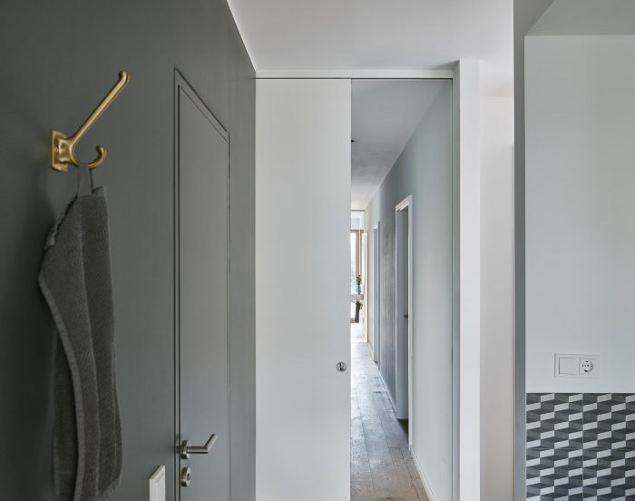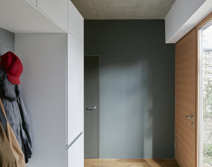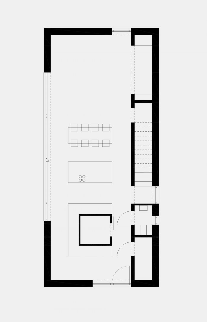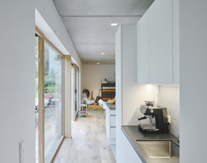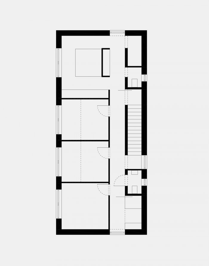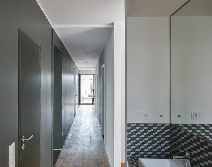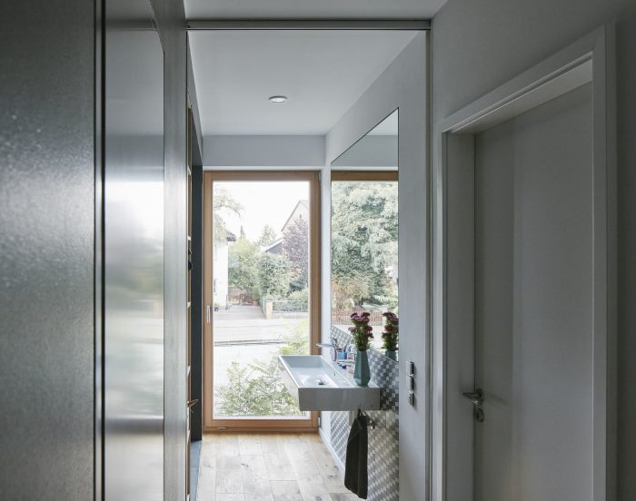The ground floor with an increased ceiling height offers a generous space for cooking, eating and quality time living - clearly separated from the buffer zone with technical, sanitary and storage space. The enormous glazing with sliding door unites the living space and the garden terrace. A free-standing box creates a comfortable entrance area with a wardrobe at the front end of the house. Additionally it contains elements of the kitchen and hides a spacious storage room inside. Due to the small available ground area and the desired three individual rooms for the children the upper floor reveals a higher density. Maximum utilisation of space is realized by using hidden sliding doors: the corridor surprisingly becomes part of the bathroom for the children, in addition a separate unit for the parents is generated. Extra loft-beds under the roof allow more space for playing.