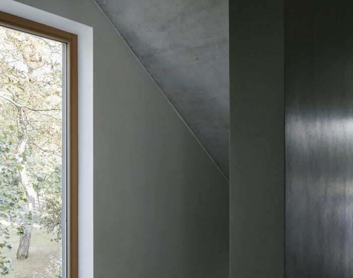 The asymmetrical position of the ridge reflects the stringent floor plan with an end-to-end dividing wall. The architects decide to cover the roof with dark roofing tiles and blend in the colour of the facade to gain the monolithic appearance of the house. Load bearing walls are constructed with sustainable and energy-efficient insulating bricks. The crafted windows are made of natural larch wood. Cost-effectiveness and the desired monolithic appearance are secured by individualizing and enhancing standard construction details. The impression of a united architectural ensemble is paradoxically achieved by using opposite colours for the two houses - furthermore by similar construction details. The old oak-trees between the two buildings become the heart of the eye-catching composition.