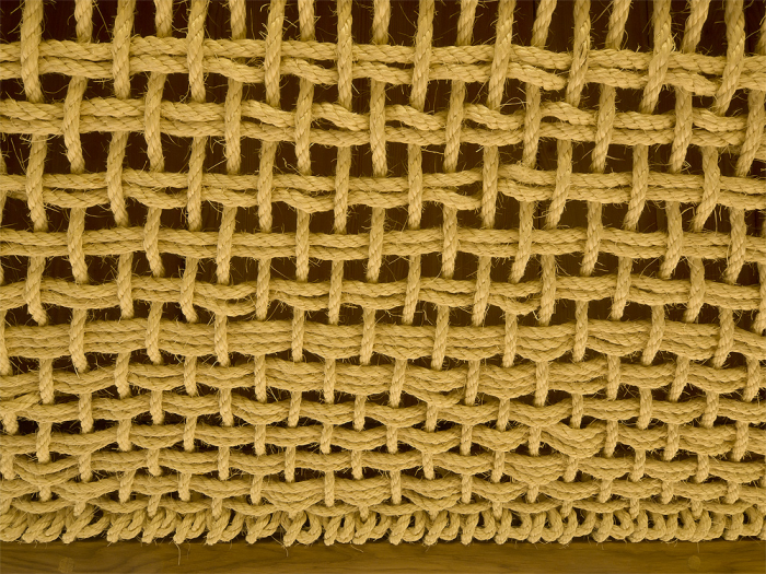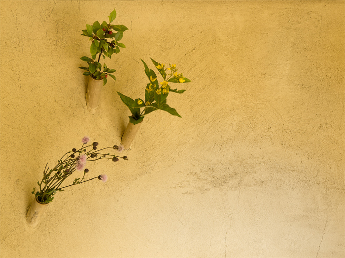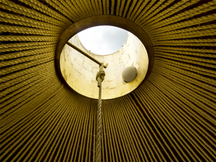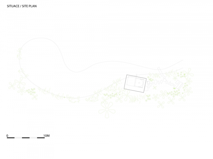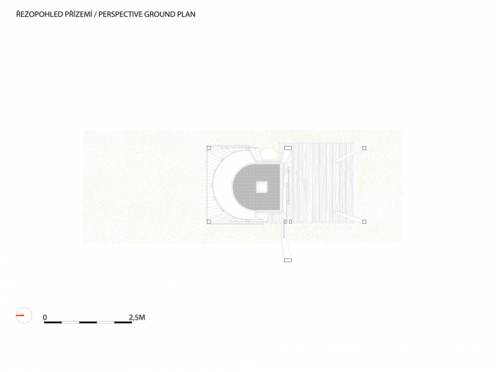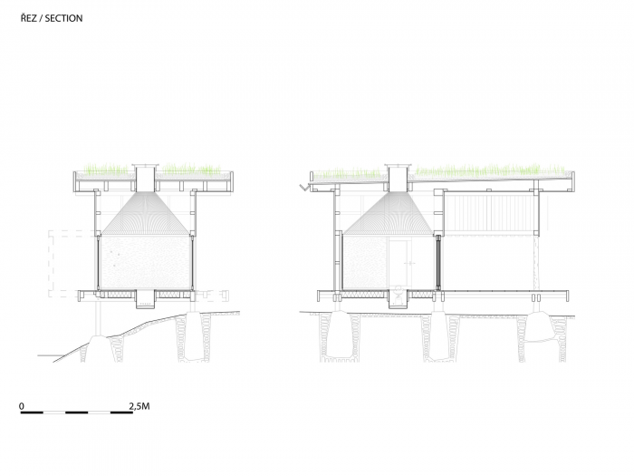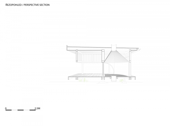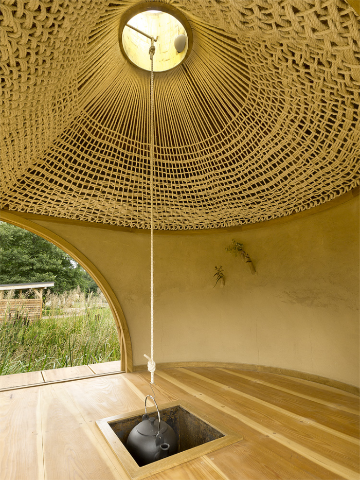 The inner space of the teahouse could be adjusted by the sliding doors, so there are more levels of perception of nearby landscape. One could enframe his own preferred view as a painting in the interior. There is a daylight play of sunbeams in gilded skylight, when the teahouse is closed. The whole interior is crowned with knitted geometry of cone soffit made out of sisal ropes. The hearth is the central point of the room, from which the space flows to large veranda built with larch planks. The veranda is a unique space for watching the water level and the life beneath. There is another important motif next to the knitted soffit in the interior, it is a rounded wall with clay plaster which integrates three bamboo vases as a reminiscence of famous japanese tokonoma – the niche for flowers and caligraphy.