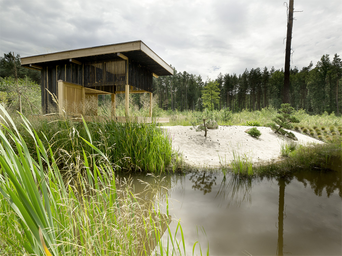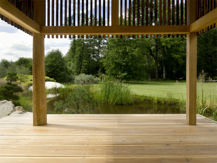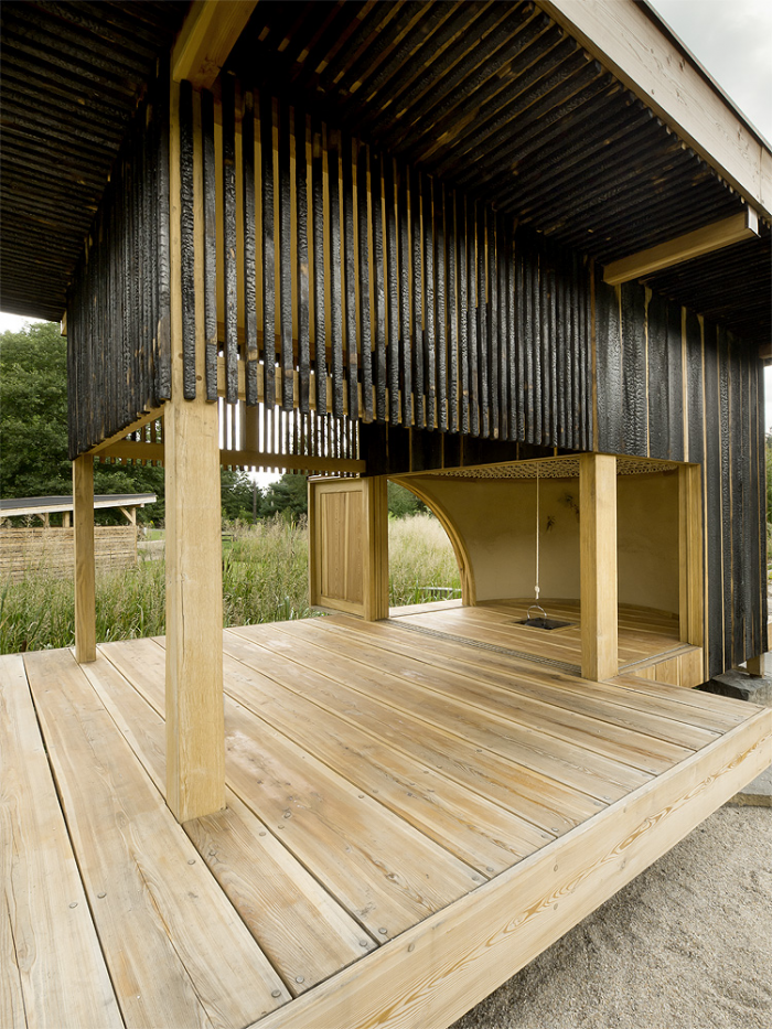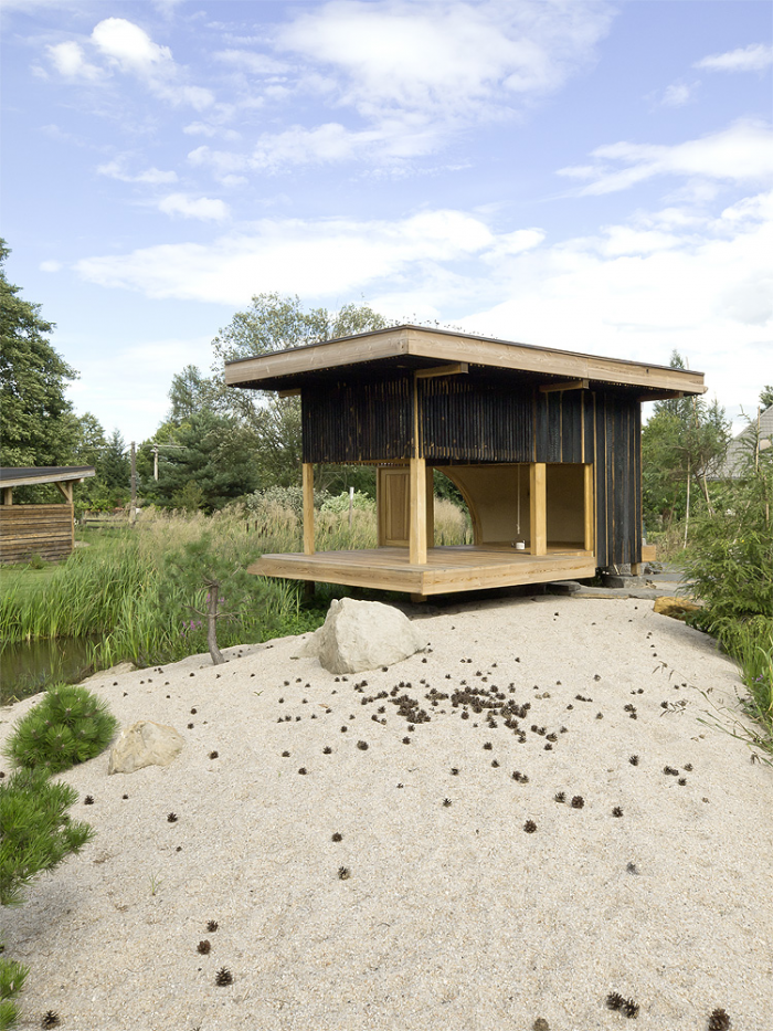 On the southern edge of garden The Black Teahouse reflects itself in water level of small dark lake. Large and exceptionally cultivated garden becomes natural part of nearby pine forest and its southern edge defined by S-shaped lake with grassy banks makes beautiful surroundings of the family house. And the Teahouse is just part of this carefully designed scenery. There is also fabulous view of the lake, which could be admired by the host and guests from the teahouse. It is a small place to gather, it is a place for a cup of tea.