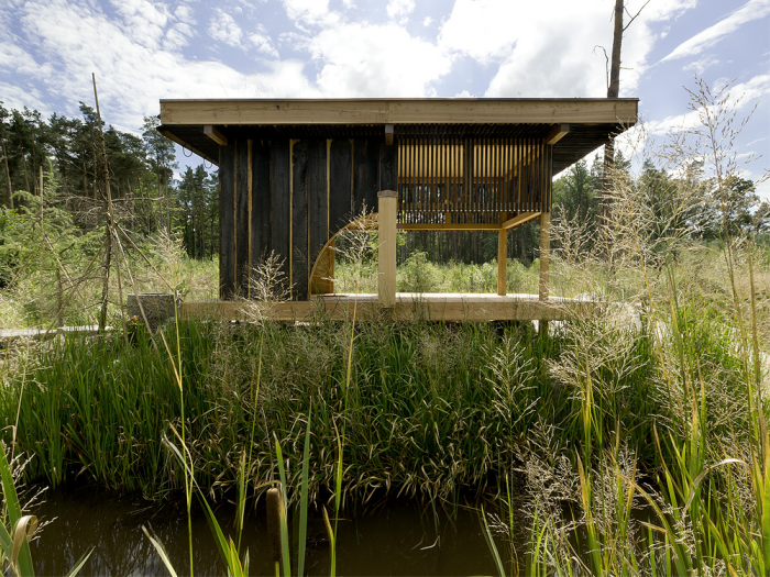 The Teahouse is carefully designed to become a natural part od the landscape and so the green roof is a fragment of grassy surroundings. The whole house is covered with charred larch facing and so it is called The Black Teahouse.