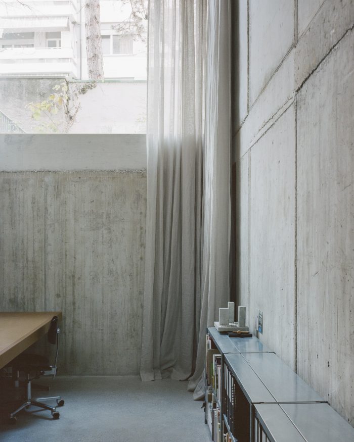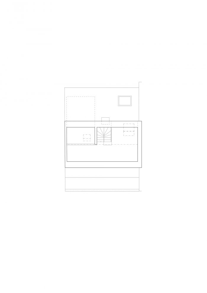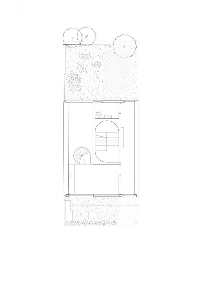 The studio is perceived as a pierced spatial unit, but functions analogously to the maisonette attic apartment disentangled over two floors. By connecting the ground-level meeting area via a staircase to an overheight workspace in the basement, the permissible building profile - already limited by the angle of light incidence - can only be fully exploited.