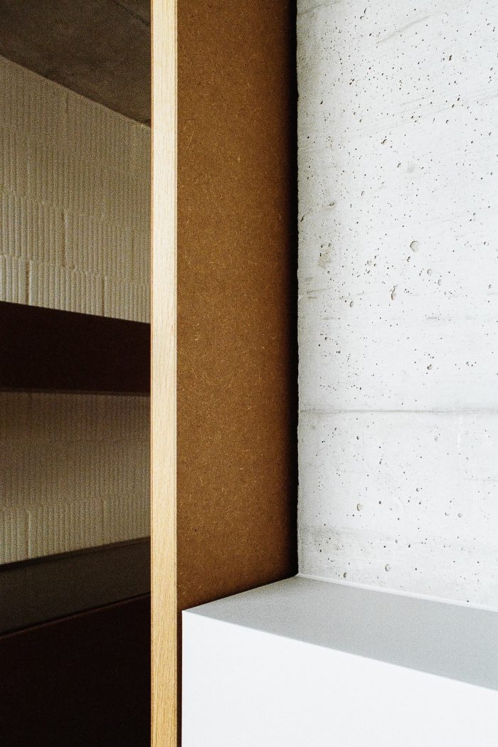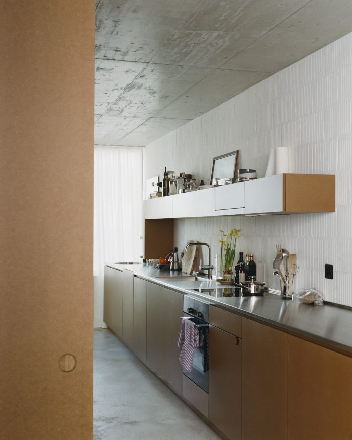 The standard apartment is characterized by a simple, open floor plan, which is fluidly modeled around the eccentrically placed core. In the form of an inner circulation, functionality is combined with a perceived generosity in a small space, and the limits of conventional spatial proportions are explored. The spatial vessel, framed with painted industrial masonry, with its horizontal spaces accompanying the two facades, finds its external counterpart in ribbon windows.