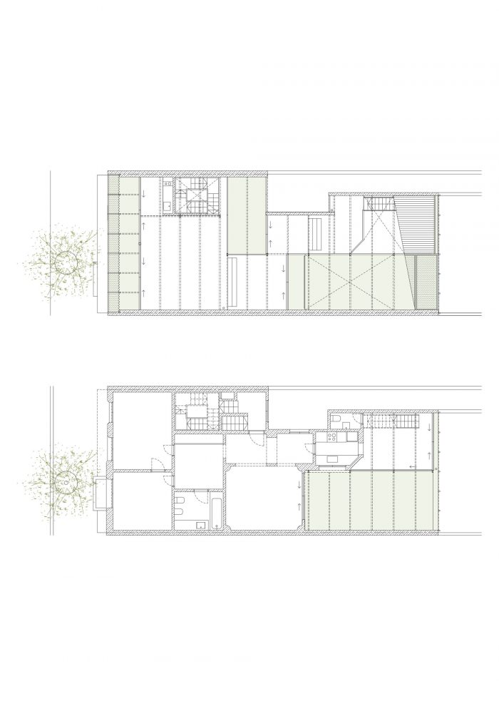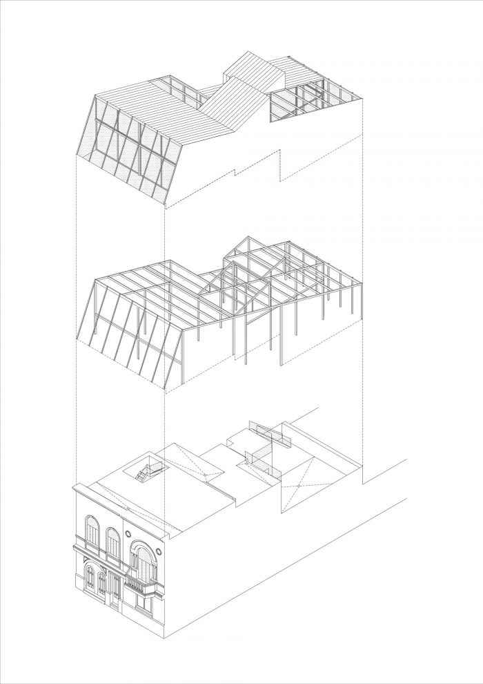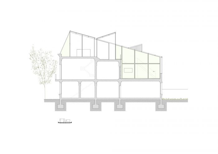 现有的不同高度的平屋顶的堆积成为新建筑的地板,分布着一系列连接在一起的室内和室外区域。一个由不透明、透明和可渗透的元素组成的围护结构覆盖了老房子的所有延伸部分,为与环境的关系提供了新的可能性。