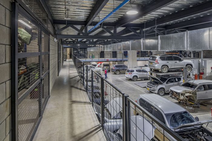 B. 一个维修50辆车的车间,这意味着一个用于机械工作和油漆的大空间。