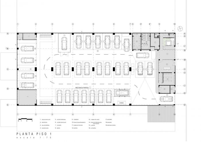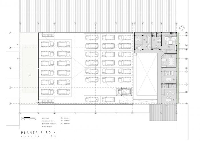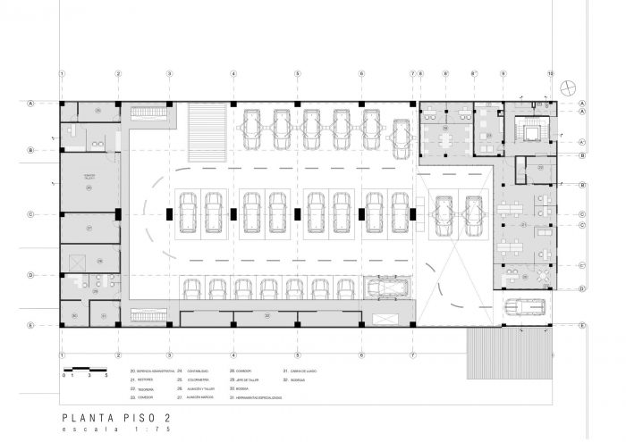 In the structural commitment of the project, we sought to create a workspace (two free floors) that would allow freedom of movement and maneuver inside the building. A metallic roof structure with a large articulated Warren-type truss guaranteed considerable light supported by concrete columns in the workshop area. The administrative area is proposed with simpler elements, combining a punctual system of concrete and metal beams. The materiality of the building was based on three materials; Concrete, steel and glass. This range allowed us to generate contrasts, exposing the truth of these materials from its facade with exposed concrete. Steel is used not only as a finishing material but as a spatial structure, which guaranteed a free floor plan. Glass is used as a translucent material that provides a diversity of transparencies and visual relationships from any point of the building. A user of the building, whether an employee or a visitor, is able to identify with the space.