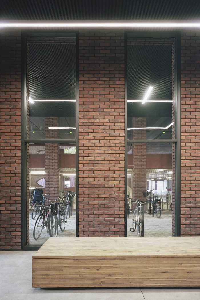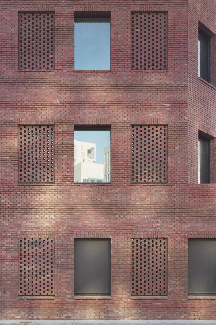 赤土砖:低层建筑(SNCF Réseau办公室和车间)和住宿塔楼用赤土砖处理,并与每个方案的不同具体(和监管)需求兼容:SNCF Réseau大楼的开口用moucharaby实心砖(安全级别高),住宿塔楼用机械固定薄砖(抗震规定),停车场设施用大体积彩色混凝土外浇,预制地板元件用粗混凝土(预应力肺板等)。