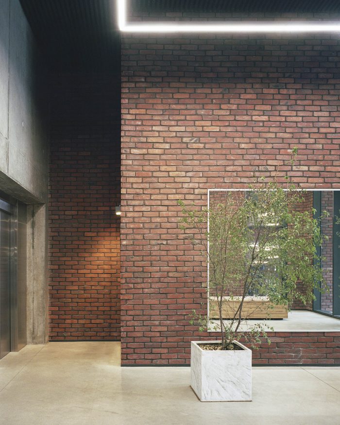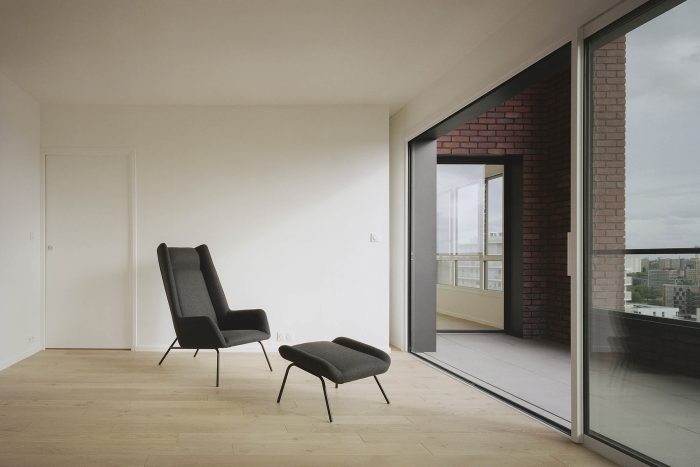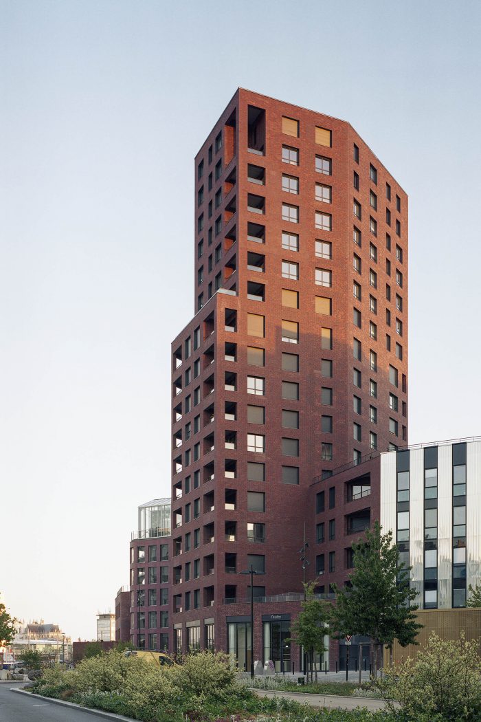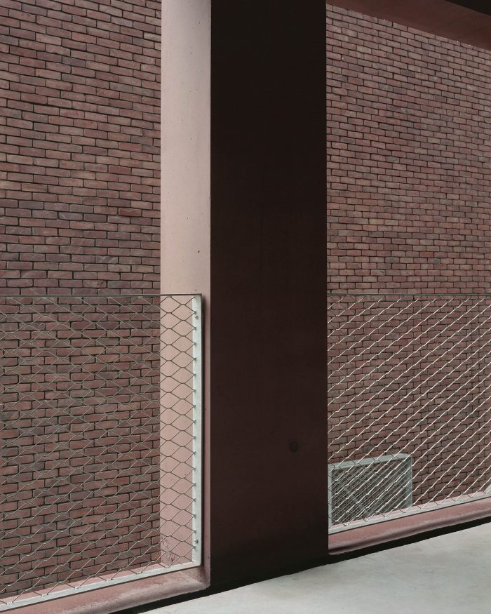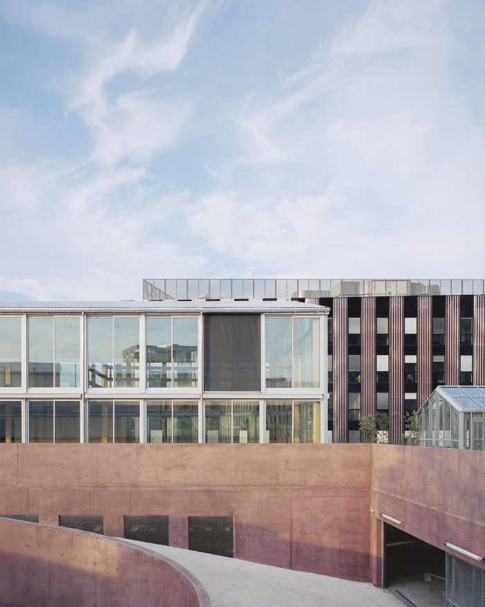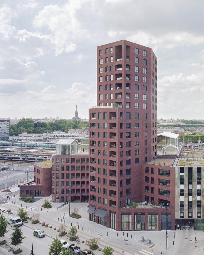 Terracotta brick: the lower building (SNCF Réseau offices and workshops) and the accommodation tower block are treated with terracotta brick and are compatible with the different specific (and regulatory) needs of each programme: moucharaby solid brick for the openings of the SNCF Réseau building (high level of safety), thin mechanically fixed bricks for the accommodation tower block (seismic regulations), mass coloured concrete exoskeleton cast for the parking facilities and rough concrete for prefabricated floor elements (pre-stressed alveolar slabs, etc.)
