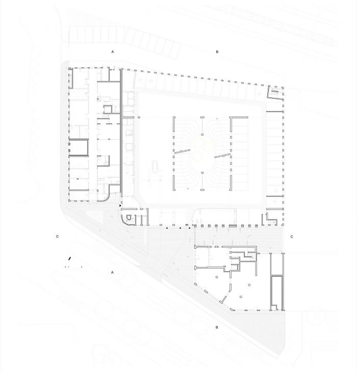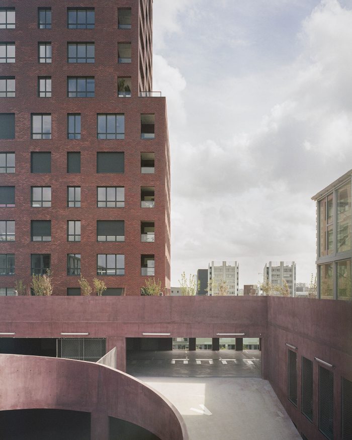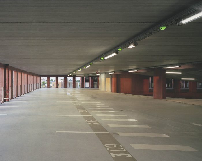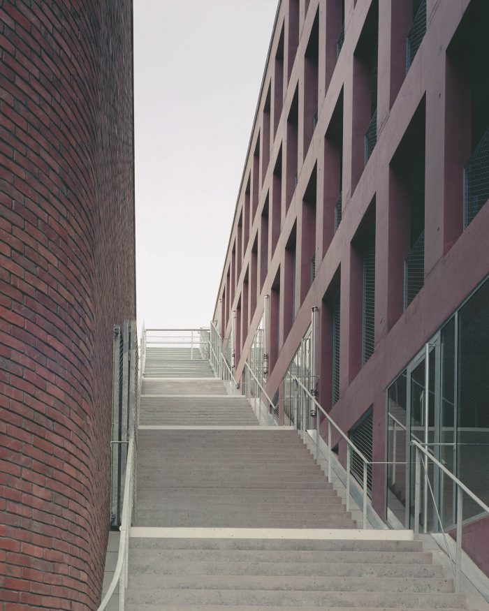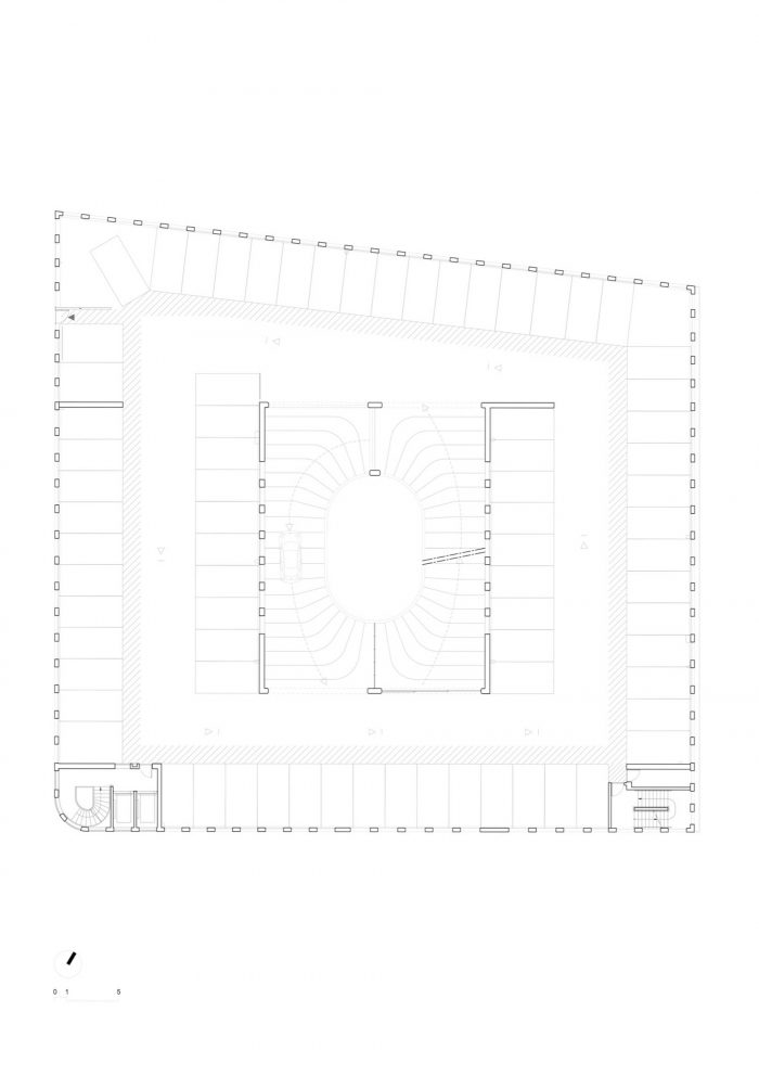 It is therefore continued throughout the project by providing a large staircase which not only guarantees the public potential of roofs by offering a street address but which also guarantees the pedestrian nature of the different car park levels.
