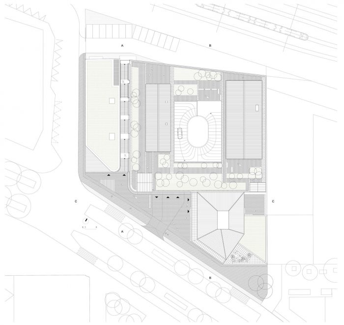 因此,它通过提供一个大的楼梯贯穿整个项目,这不仅保证了屋顶的公共潜力,提供了一个街道地址,而且还保证了不同停车场层的步行性质。