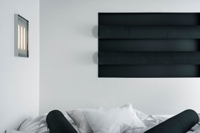 前面最大的方块是一个嵌在墙上的枕头。 还有一张桌子、一条桌腿、一个床盘、一面镜子和间接照明,都像艺术品一样陈列着。 换句话说,这个房间里没有艺术,只有抽象化和框架化的功能。