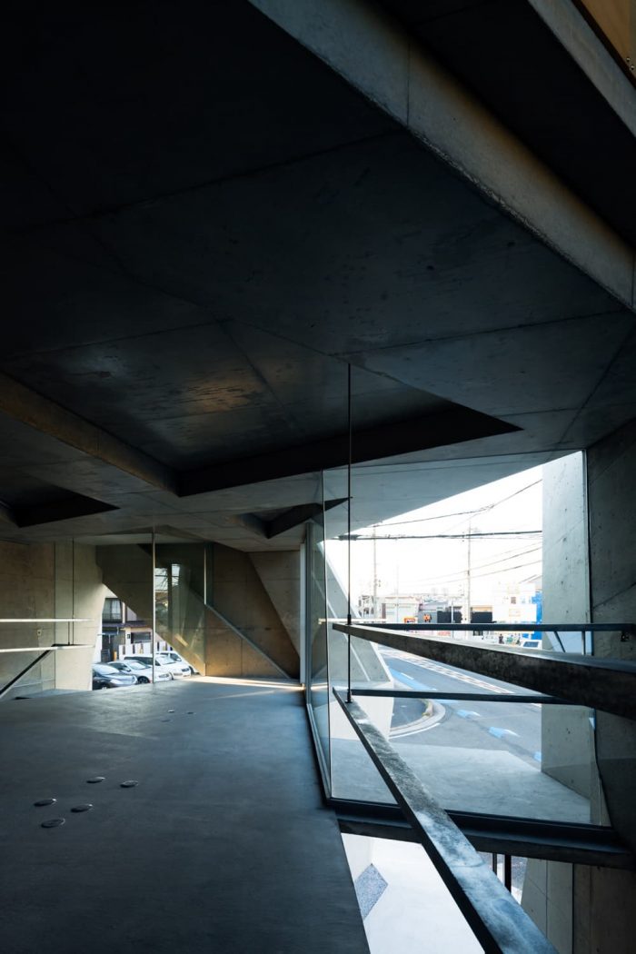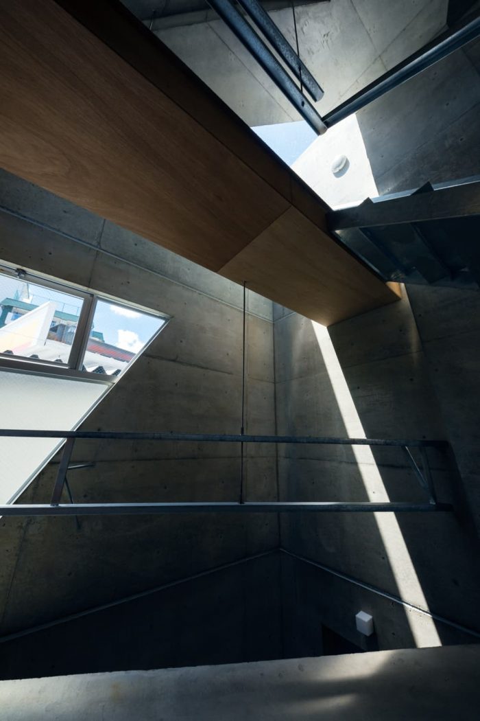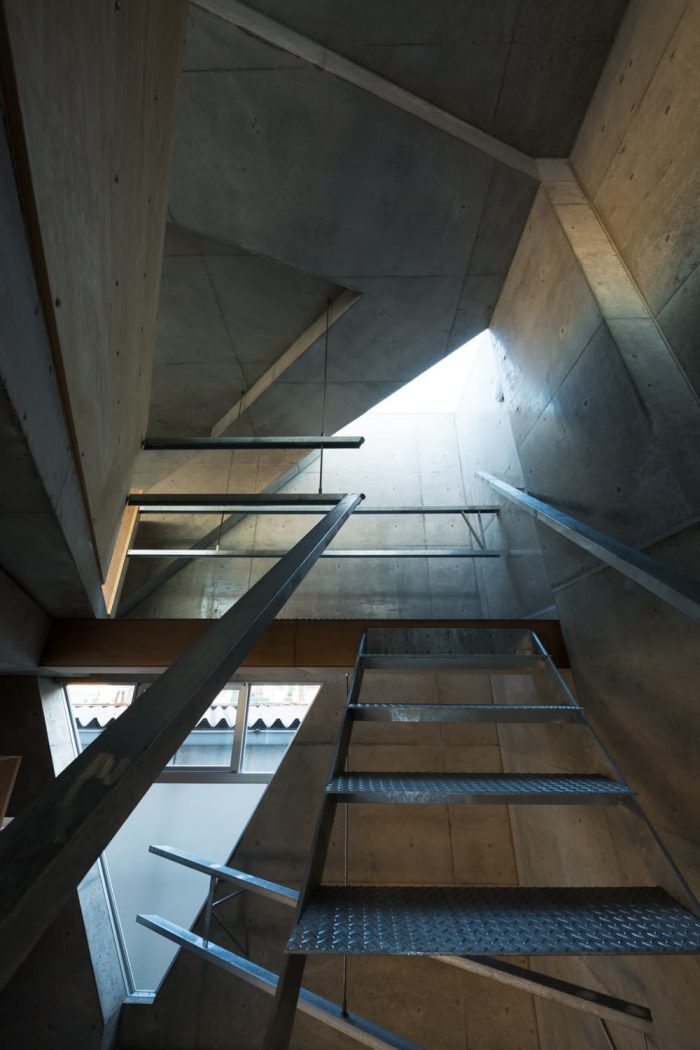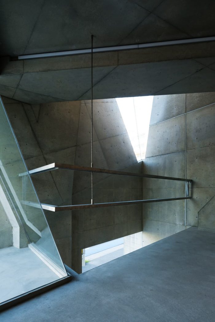 另外,为了将建筑重量减少到这种常规结构的60%,我尽可能地从箱形结构中刨去了混凝土。出现在我眼前的结果是一个独特的结构,类似于哈密瓜的网状皮肤。这是我以前从未见过的东西,宁静而精致,仿佛是我在结构中雕刻出的佛。开口上了玻璃,安装了镀锌钢楼梯,并设计了极简的悬挂式扶手,以避免削弱结构的力量和宁静。我还设计了一些内置家具,只使用劳安胶合板,这种材料主要用作底板和背板。