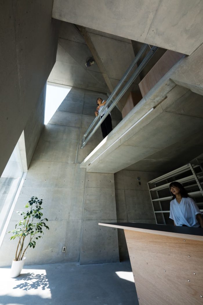 Also, in order to reduce the building weight to 60 percent of a regular structure of this sort, I shaved off as much concrete as possible from the box-frame structure. The result that emerged before my eyes was a unique structure resembling the mesh-like skin of a cantaloupe. It was something I had never seen before, serene and refined as if I had carved out the Buddha in the structure. The openings were glazed, galvanized steel stairs were installed, and minimalistic suspended handrails were designed with the utmost care not to diminish the power and serenity of the structure. I also designed some built-in furniture using only Lauan plywood, a material mainly used as underlayment and backer boards.