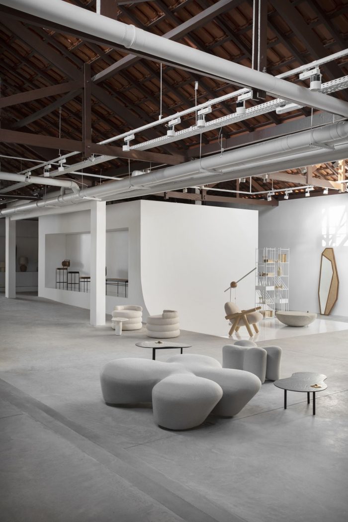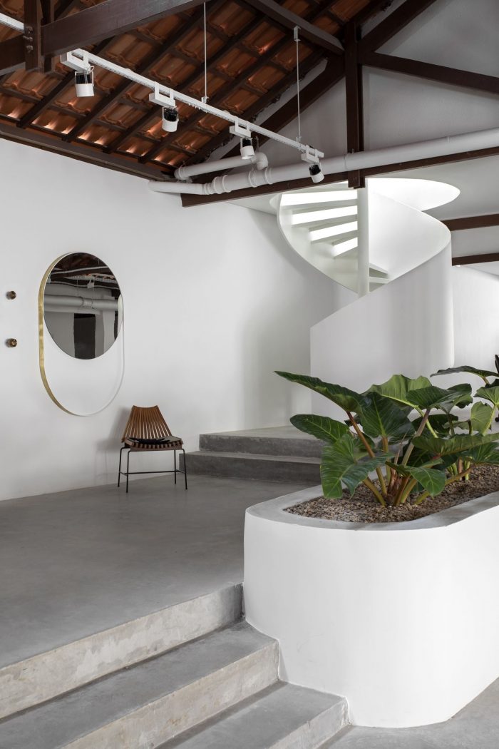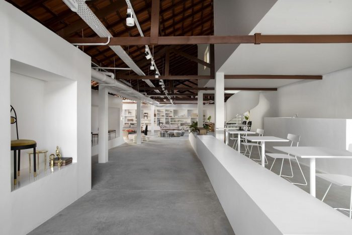 The interventions happen through the simplicity of the walls and volumes, as well as all the infrastructures that are exposed and present themselves in white and start to highlight the materiality and texture both of the old structure and the points of intervention of the project. The idea is to have a project that is welcoming to the various uses proposed by the brand, and at the same time works as a space that highlights the products, bringing a new experience and relationship with the design, as the brand itself proposes from its very beginning.