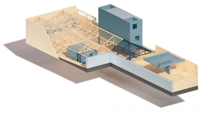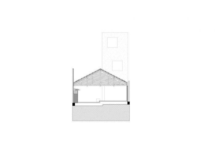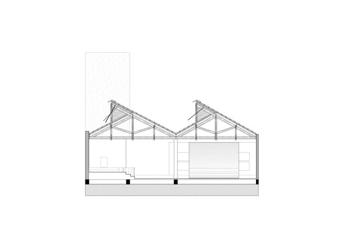 一个大的、灵活的空间带来了从人行道到商店的流畅性。凹陷的入口,几乎是人行道的延续,使道路变得诱人和易于接受,通过楼梯和通道坡道被开发,引导用户进入商店,并将道路本身转化为平台和使用空间。这条路穿过一个标志着通道的顶棚,创造了一个阴影空间,它降低了用户的视线,在穿过顶棚后,再次扩大并打开,露出棚子的结构和切割屋顶的整体块。这种饱满和空旷的空间之间的过渡以及空间与光线的关系本身创造了一种直观的动态,导致商店的内部。