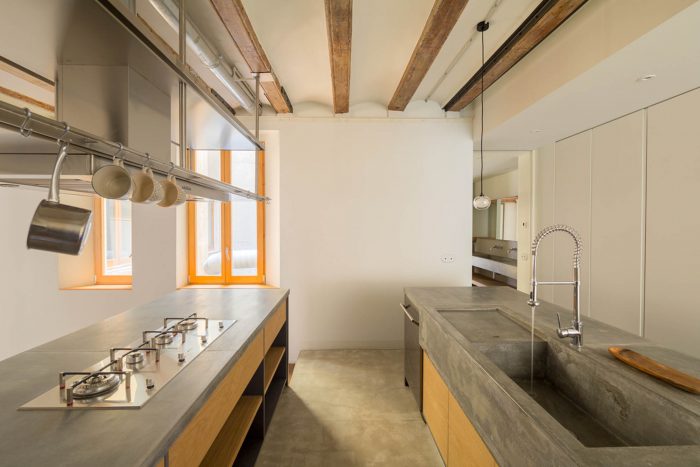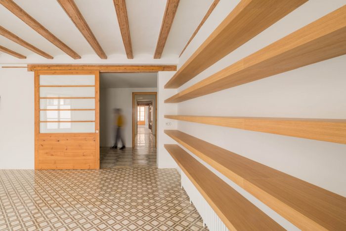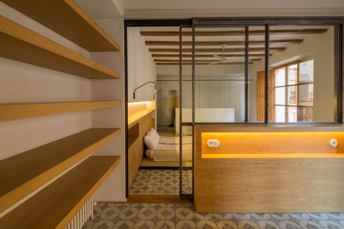 With this strong focus on versatility, she wanted the uses of different rooms to be interchangeable so as not to create any sort of spatial hierarchy. The kitchen would be central, as the hub of activity and a link to other areas in the apartment. Another important feature from the beginning of the project was the shelving, thanks to which the apartment would become a sizeable library, while retaining the feel of an urban refuge in the centre of Barcelona.