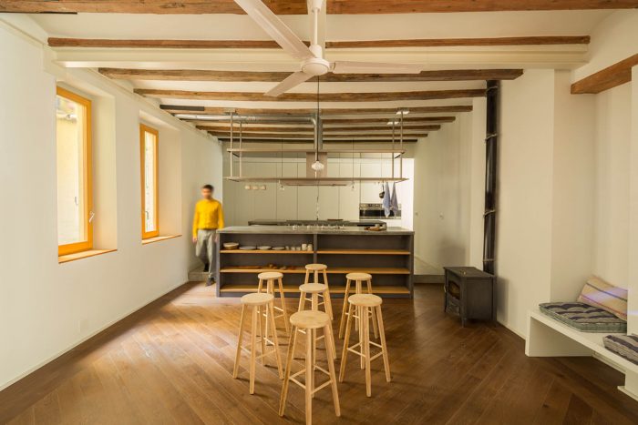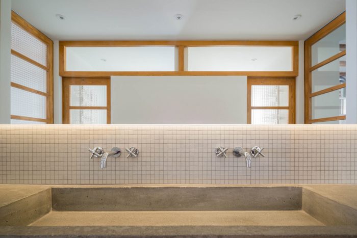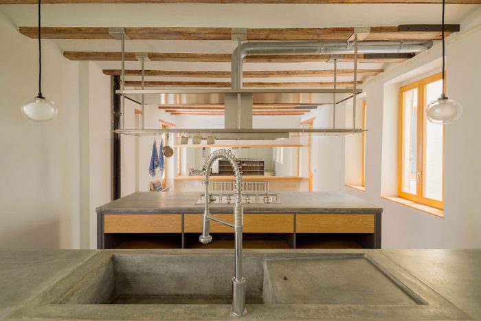 Once the building was stripped down, new materials and finishing textures were selected in line with the existing materials. We used concrete for the worktops, the sinks and to complement the flooring; we used wood for the shelving and storage areas; and we used steel for the room dividers and the open clothes storage.