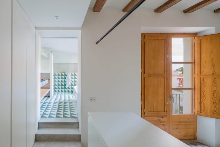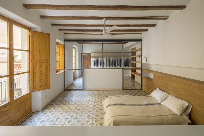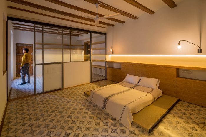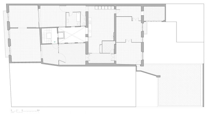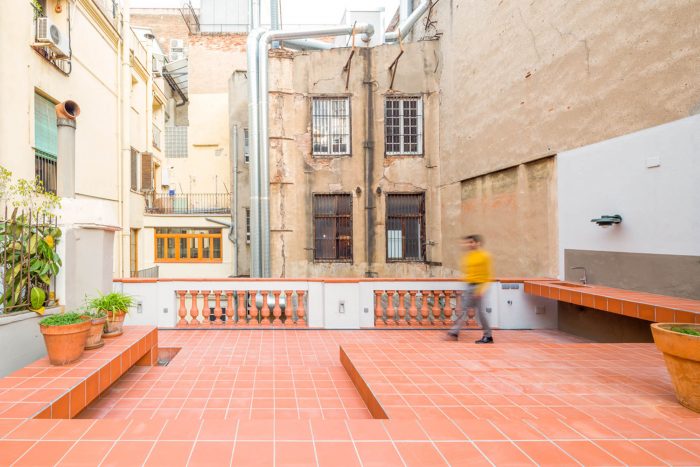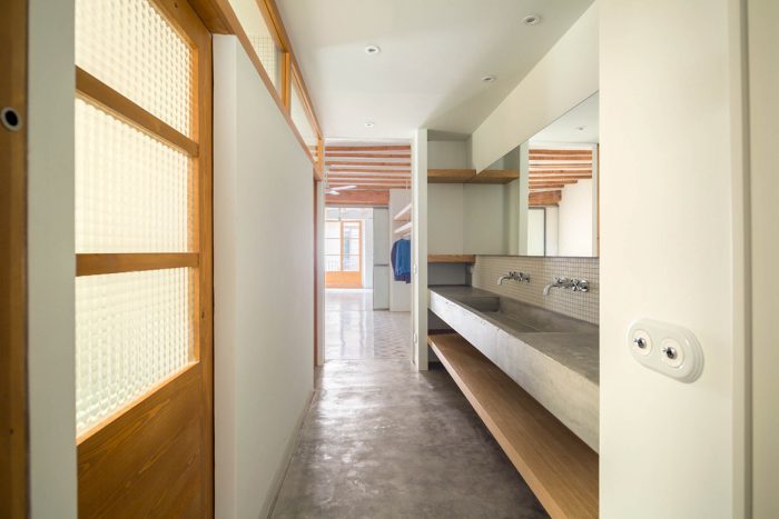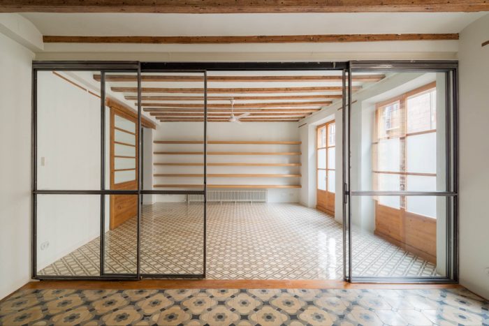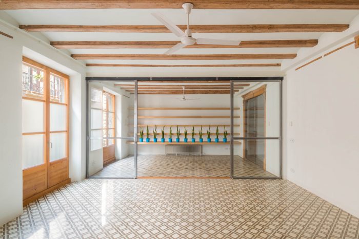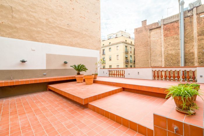 The apartment, located in a building in Raval, just a few metres from La Rambla, is an achievement of space. As you walk in, it opens up from the main façade to the rear terrace, which looks over the Boqueria market. Initially, we were surprised to see that the apartment occupied the entire floor of the building, with a contrast of large and small obsolete spaces and proportionally limited connection to the enormous, uneven terrace.