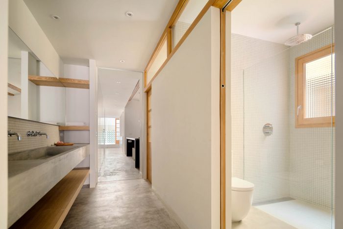 Similarly, we decided to remove the smaller passageways in order to prioritize the work spaces, located along the central and interior corridors. The kitchen, bathrooms, laundry and storage rooms are interconnected via the central patio, which facilitates movement throughout the apartment. We set out the areas closest to the façade so that they could be separated when needed, while still letting light reach the rest of the building. The most private area next to the interior wall became a ‘flat within a flat’, complete with a master bedroom, fully equipped bathroom, dressing room and office space. It is also possible to split the space into two bedrooms, without jeopardizing accessibility from the master bedroom.