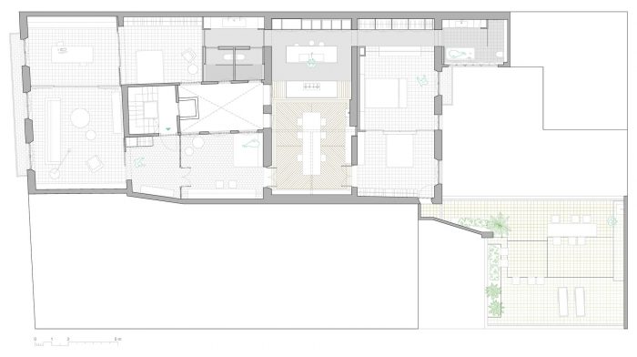 In the terrace, we concentrated on restoring the original elements, such as the balustrades. We also redesigned the layout, creating overlapping sections on different levels, in order to optimise the use of the space. Just as with the building’s interior, the existing ceramic tiles were used. In this project, following an unconventional brief, we have designed and created a system of interconnecting spaces, which can be adapted to meet the needs of the client. This ensures that areas can take on a multitude of functions at any one time, while retaining the original flow of movement around the central patio.