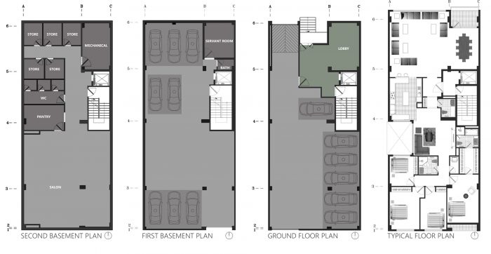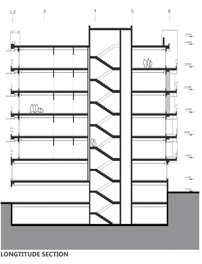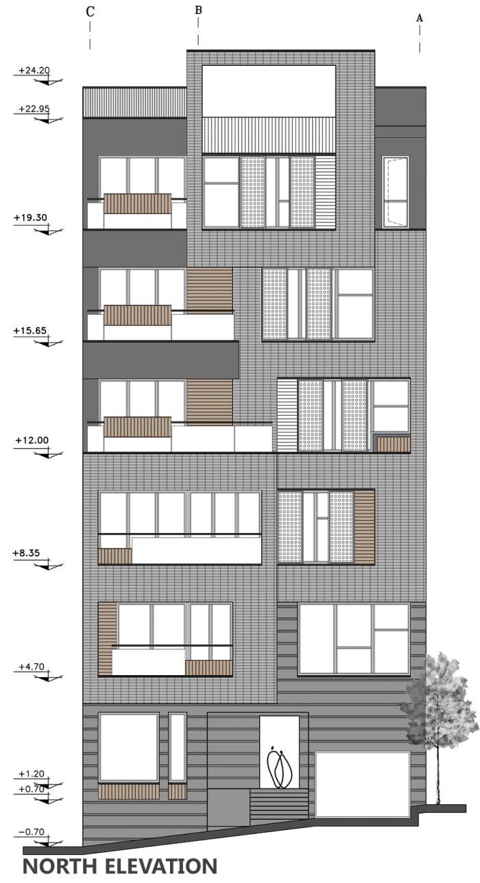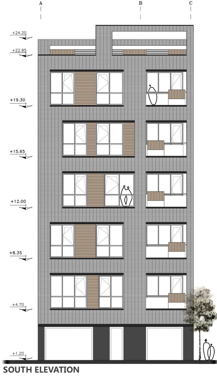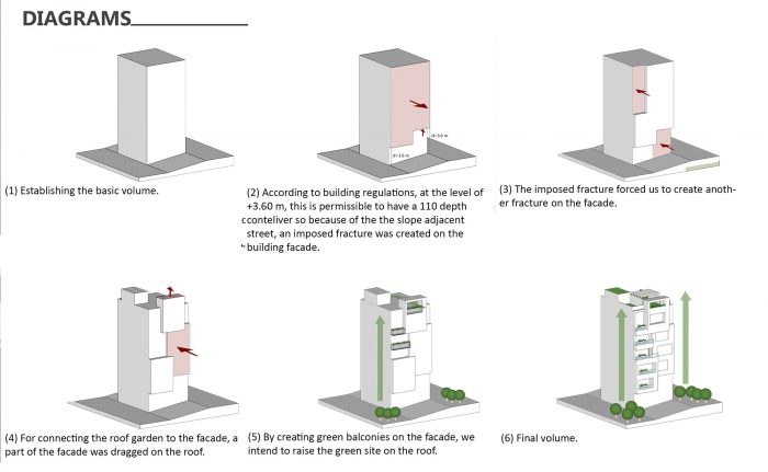 In the following, the building form was constructed as a result of the susceptibility from the environmental impacts such as the slope of the street and the trees around the building. In order to establish a link between the urban green space and the green roof of the project, the main facade of the building obtain a dynamic shape by creating a hierarchical sequence of brick volumes through the use of green balconies and its extension to the roof.