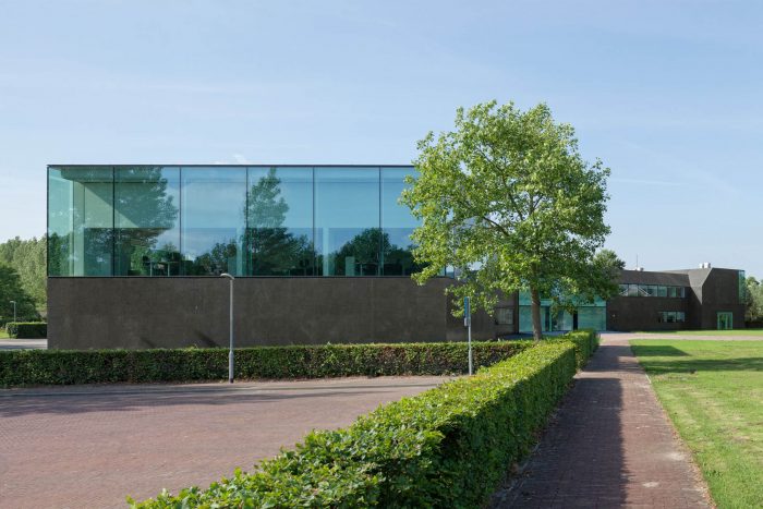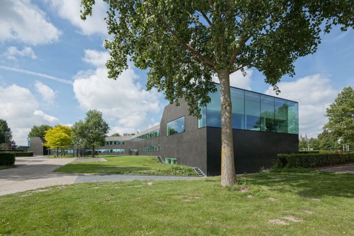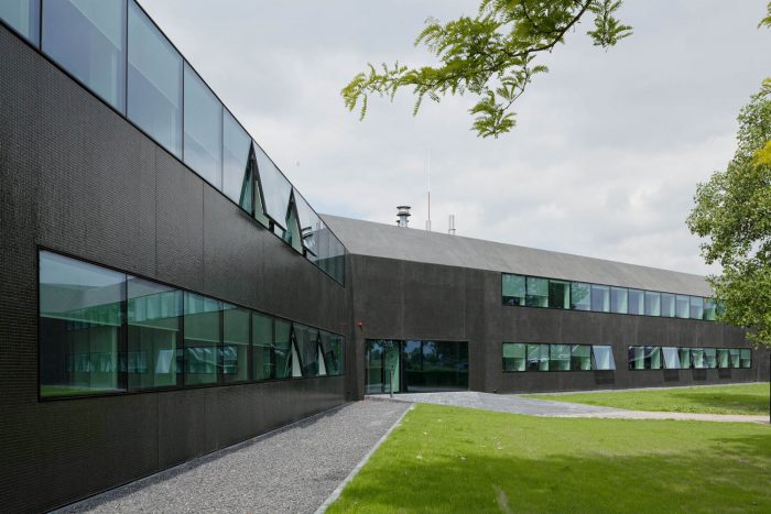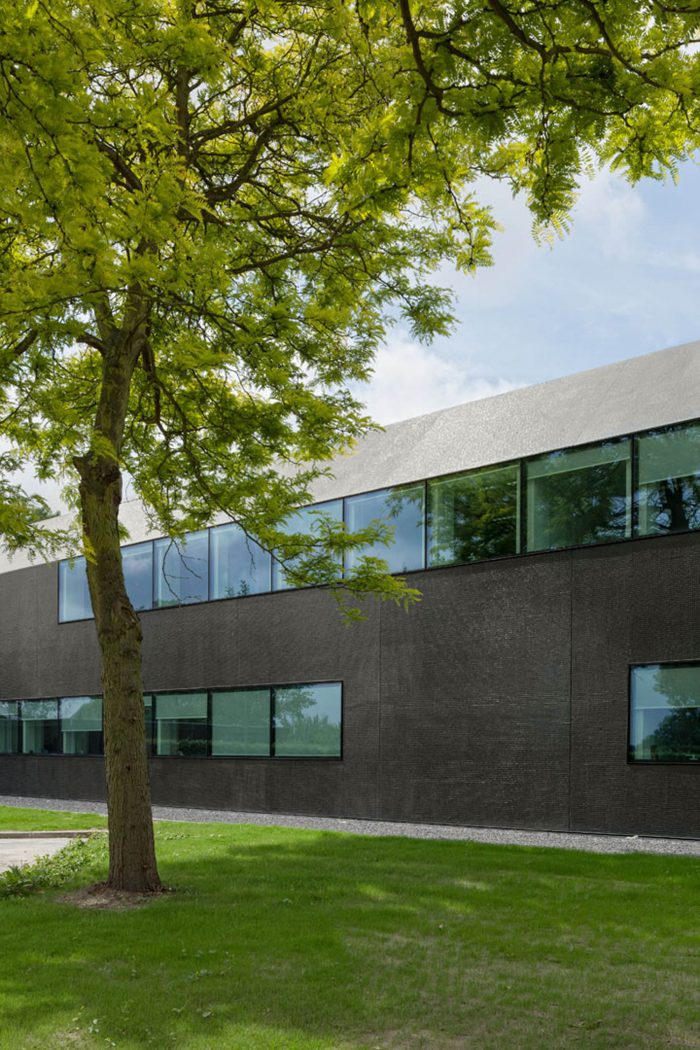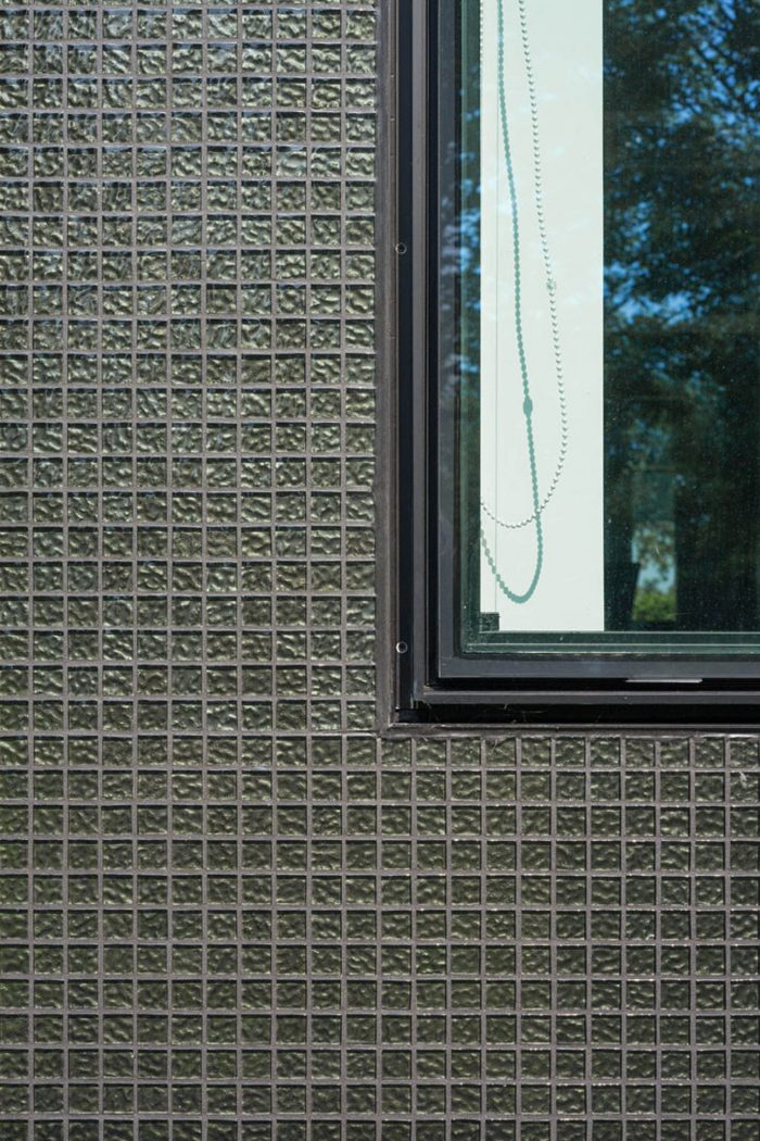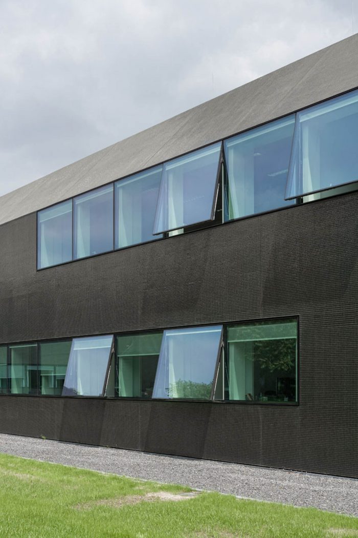 In a second step, the fragmented building shape was tamed and visually integrated by consequently wrapping the façade as well as the roof with one façade material. The new façade consists of glass mosaic tiles, which are glued on mounting plates and placed in front of a new insulation layer on the existing brick walls. The tiles were custom-made in China. Through the process of enameling rich light reflections are created. The black and green colour visually binds the building together and ads to the impression of compactness. At the same time, the colour refers to the tarred barns, which are typical in the Zeeland surrounding.