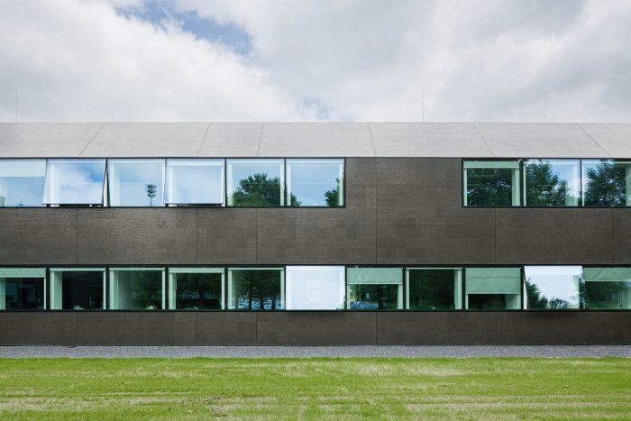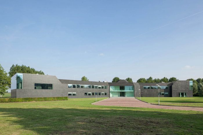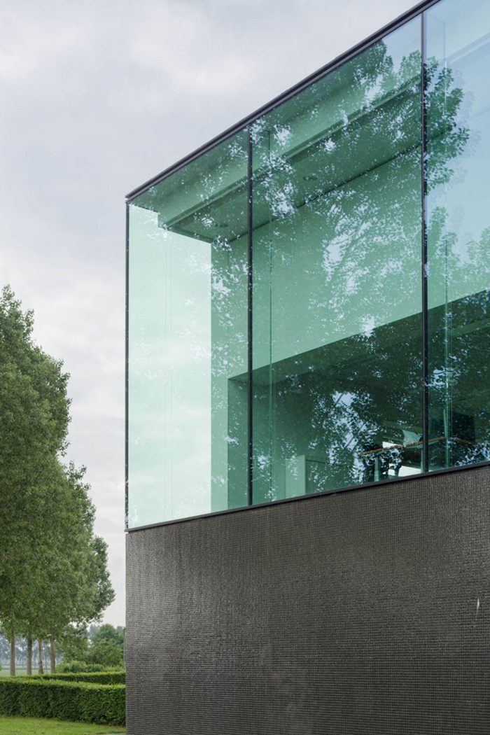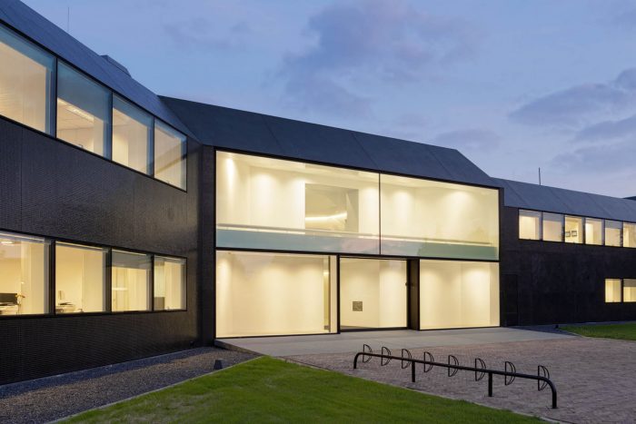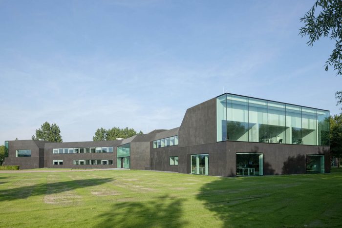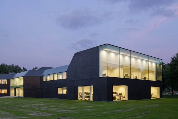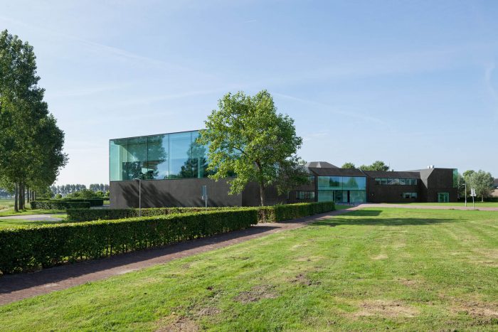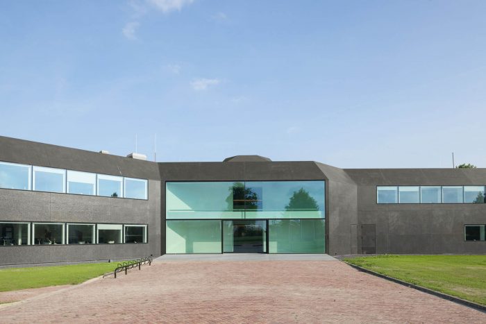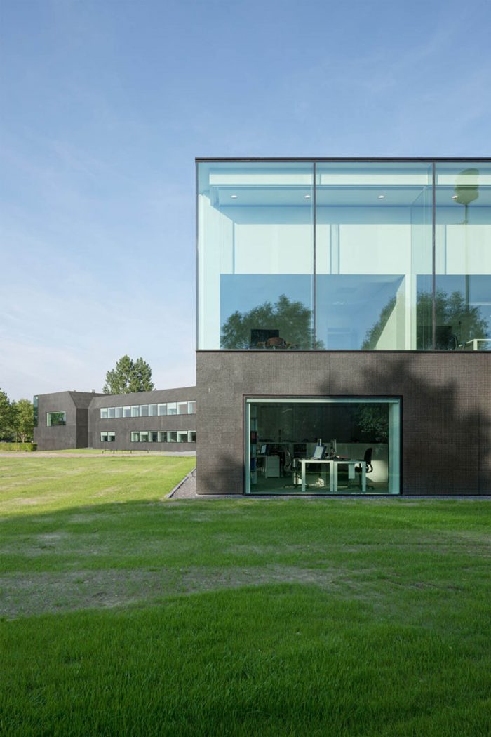 In a second step, the fragmented building shape was tamed and visually integrated by consequently wrapping the façade as well as the roof with one façade material. The new façade consists of glass mosaic tiles, which are glued on mounting plates and placed in front of a new insulation layer on the existing brick walls. The tiles were custom-made in China. Through the process of enameling rich light reflections are created. The black and green colour visually binds the building together and ads to the impression of compactness. At the same time, the colour refers to the tarred barns, which are typical in the Zeeland surrounding.