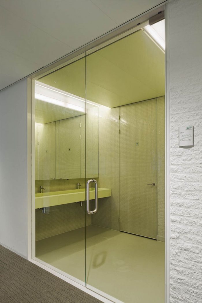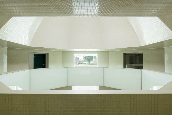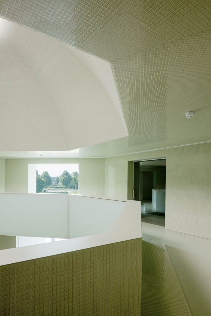 Regarding the interior, several steps were taken to improve the atmosphere and working conditions of the town hall. In particular, the two- floor high entrance hall turned out to be challenging. Since the existing geometry was unclear and the client wanted a more modern appearance, the architects decided to fundamentally reorganize the hall. The entrance hall was strategically downsized and organized in an octagonal shape, which was the result of the existing octagon-shape floor opening in the first floor. Within this new structure, it was also possible to create new meeting rooms and a separable reception area around the hall. The new ceiling was developed as a dome, again as a result of the existing octagon. In order to create a fluent experience between interior and exterior, the entrance hall was as well materialized from glass mosaic tiles, this time in a light – reflecting mint-green colour. The hall is illuminated by a circular skylight. The glass balustrades on the first floor are luminaires, which additionally spread light throughout the hall. Generous office landscapes were situated at the three heads of the building. Here, the fully glazed façades offer a panoramic view towards the green surrounding and the landscape of Zeeland.