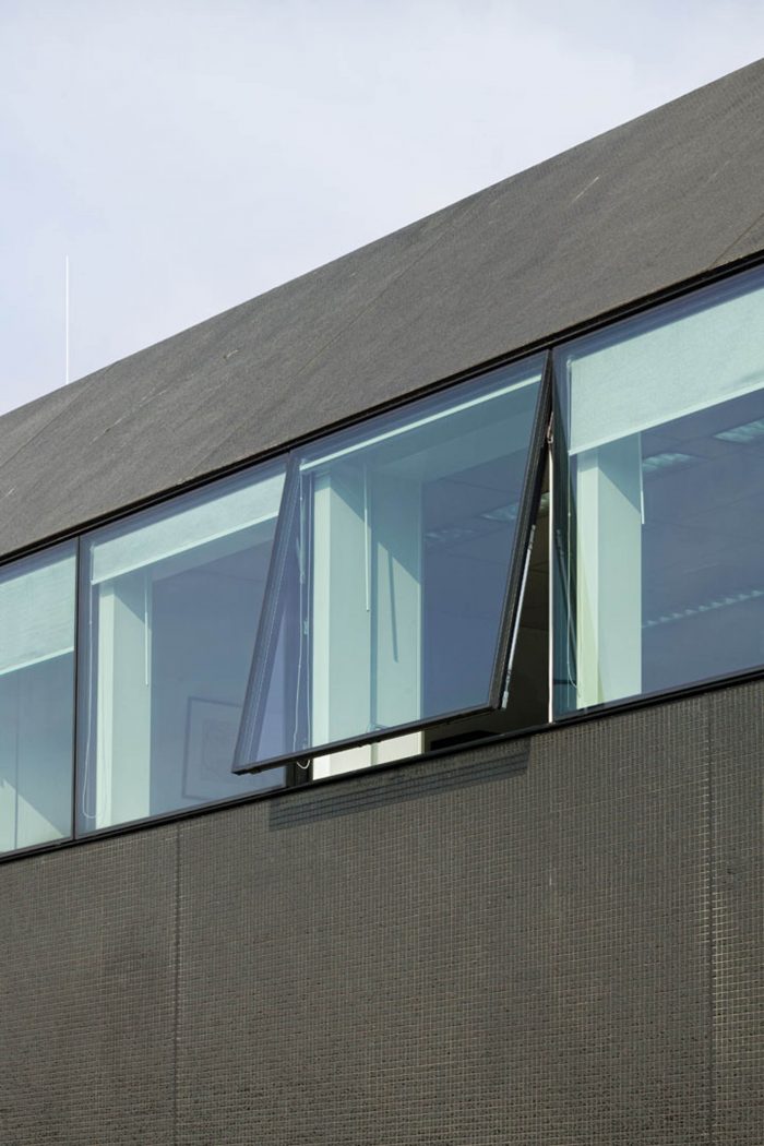 The last step of the external renewal was to refine the proportions of the building. All exterior technical installations such as water pipes, ventilation grids and sun screens where removed. Several windows were adjusted. The window grid was enlarged to a format of 1,8m x 1,6m per window. The frames are filigree “pivoting frames” with solar glass filling. High performing textile screens were installed on the inside to provide additional sun protection.
