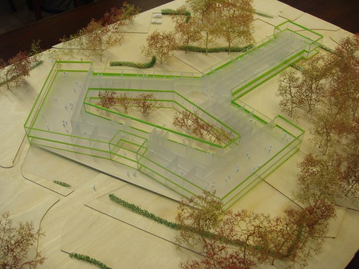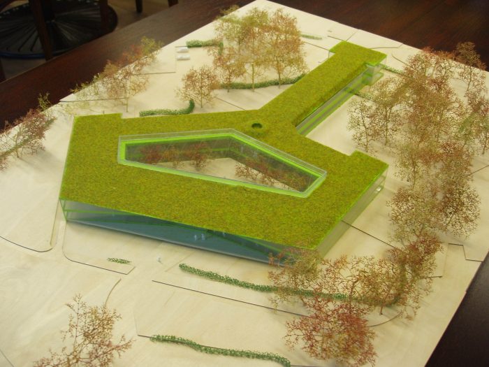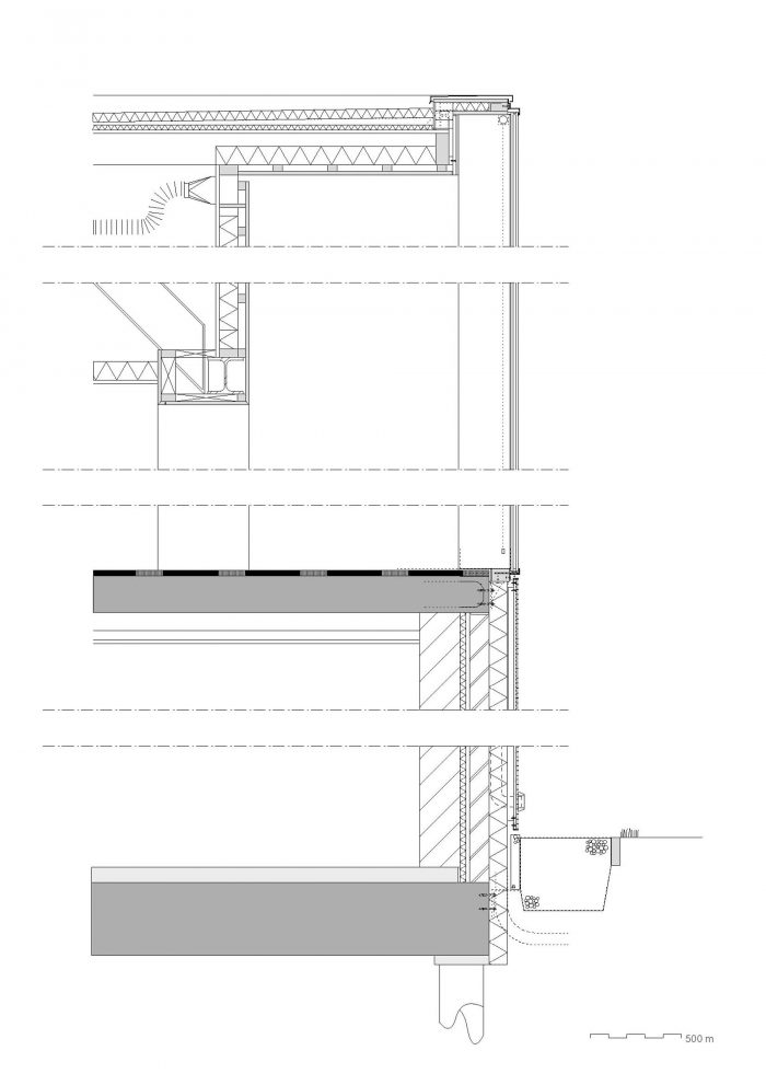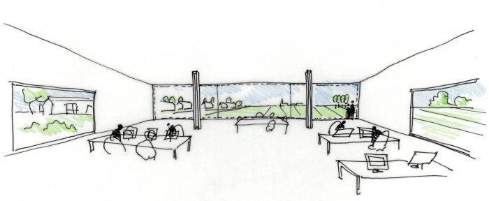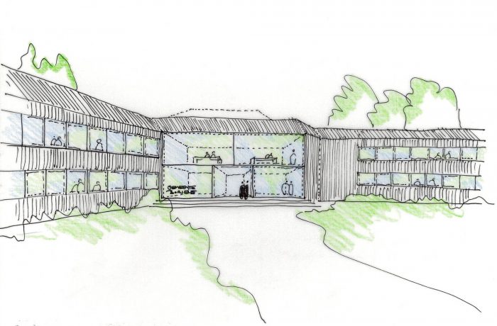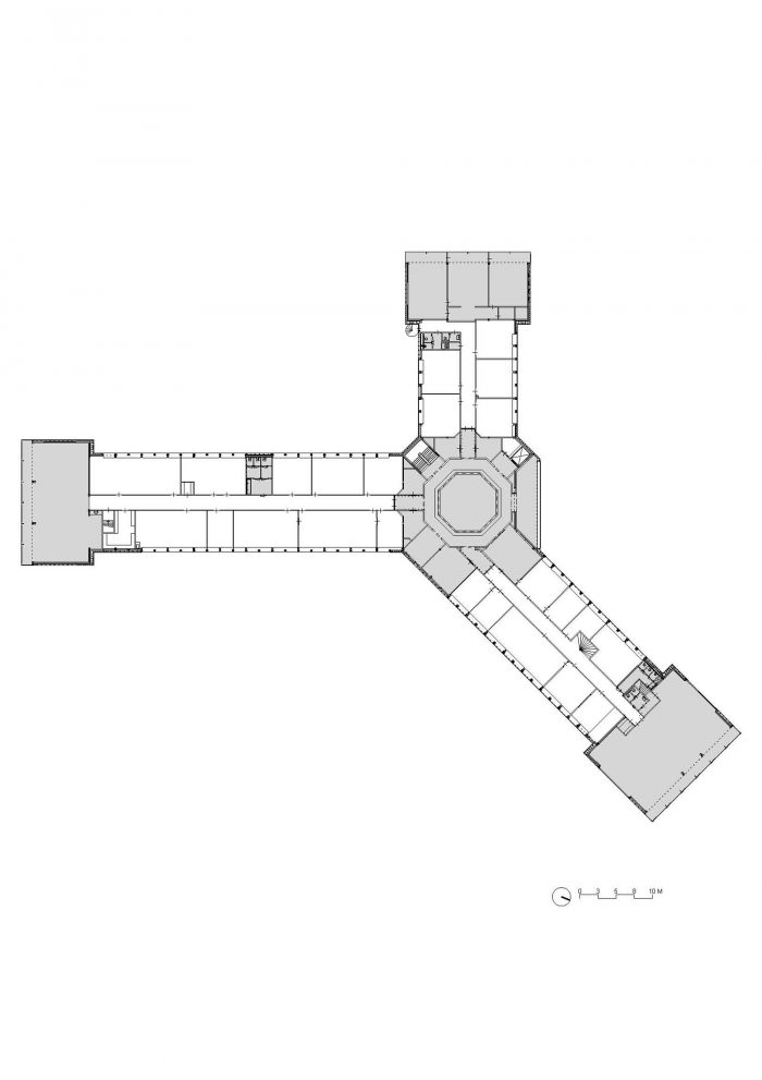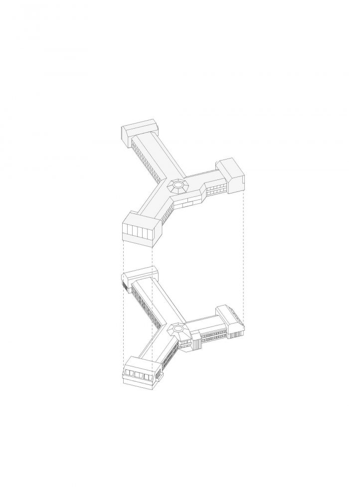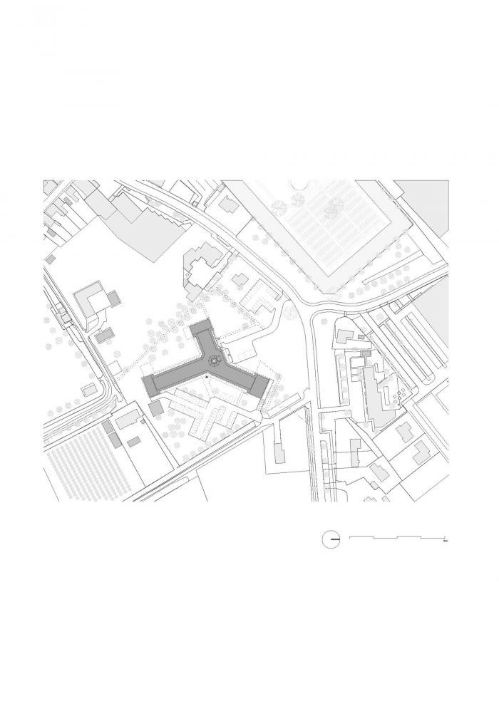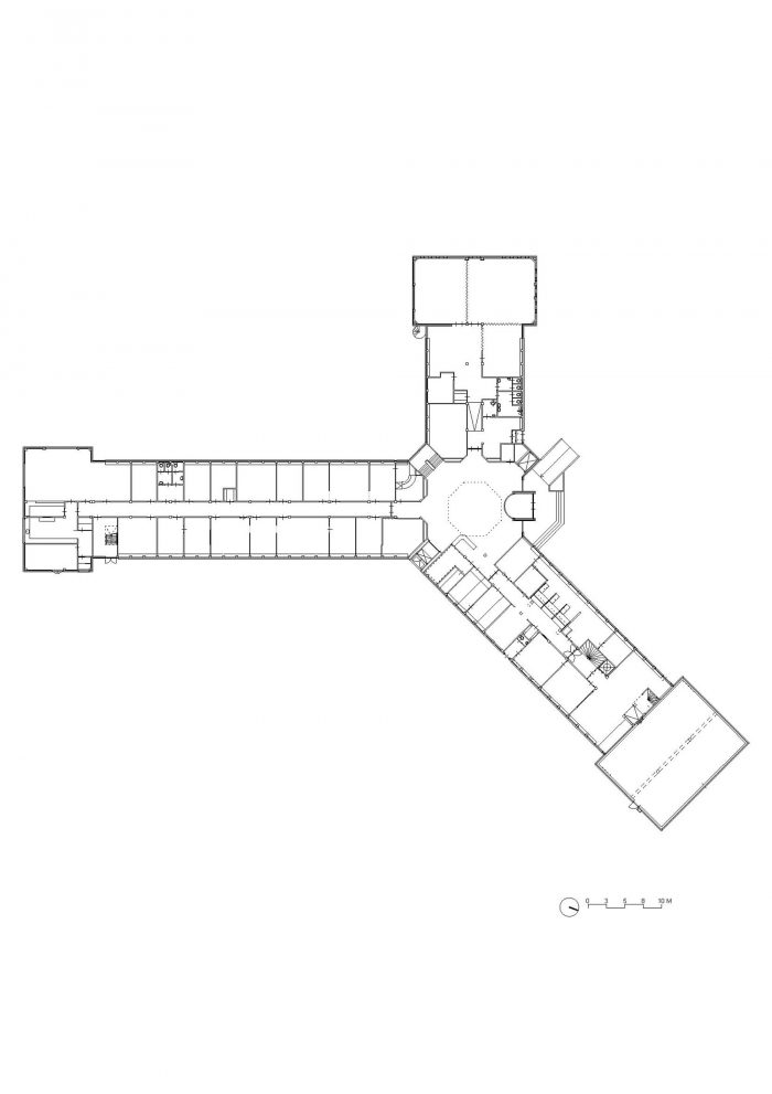 In a first step, the architects decided to adjust the three “heads” and the entrance hall of the star-shaped building, in order to partly clarify the existing geometry and to strengthen the building’s position within the context of the village. The façades of the heads where removed to a great extend and generous structurally glued glass facades were added. By that, the interior of the building became visible and a relation with the exterior was created. Furthermore, the entrance hall was slightly extended towards the outside, in order to enhance the visibility from the main road.