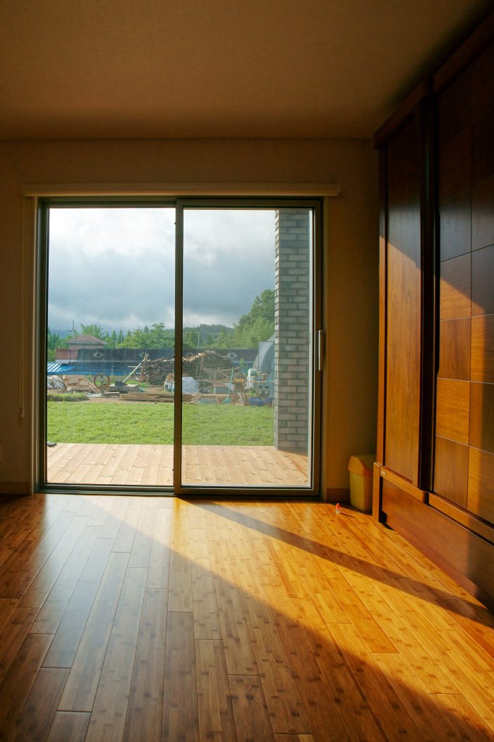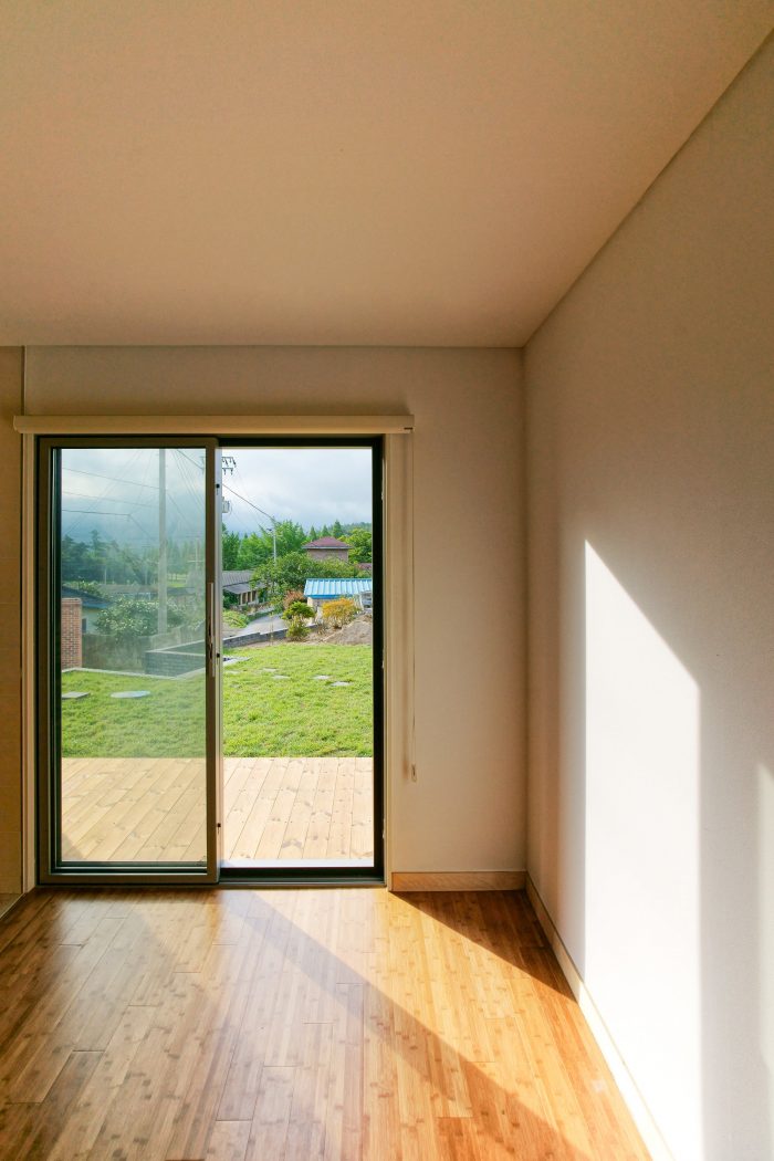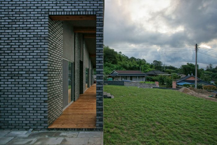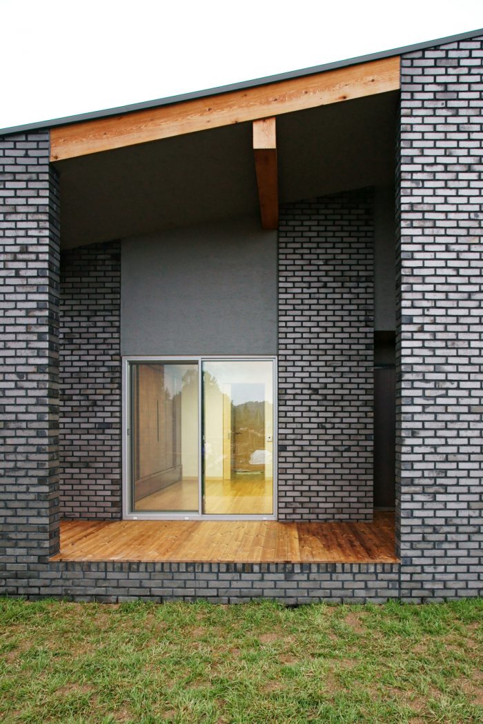 Throughout the basic design meeting, a slant roof was recommended, due to insulation, amount of snowfall and harmony with nearby mountain figure and town alley ways, and the structure was naturally shifted from ferroconcrete to light frame wood. By observing neighboring houses, one-story slant roof house finished with traditional bricks with Toenmaru (narrow wooden porch running along the outside of room in traditional Korean-style house) was proposed like other houses in town, and easy communication with neighbors was pursued by making low fences. Toenmaru is small, but a characteristic space that can control sunshine with roof eaves, and can gather people through the open space nearby.