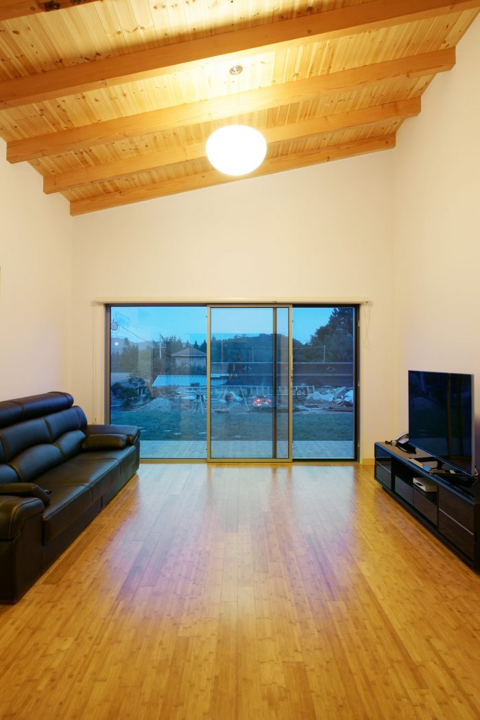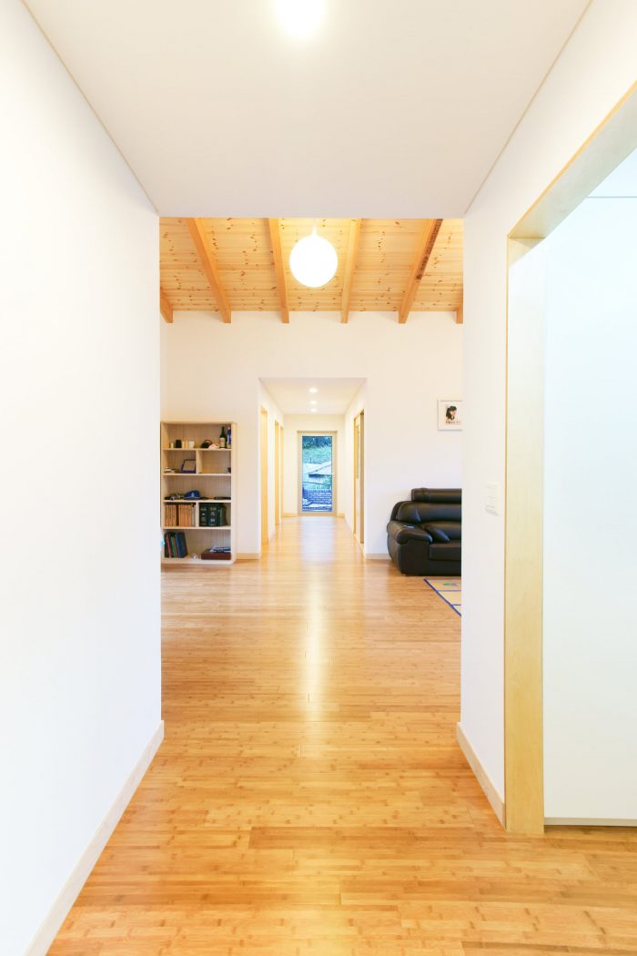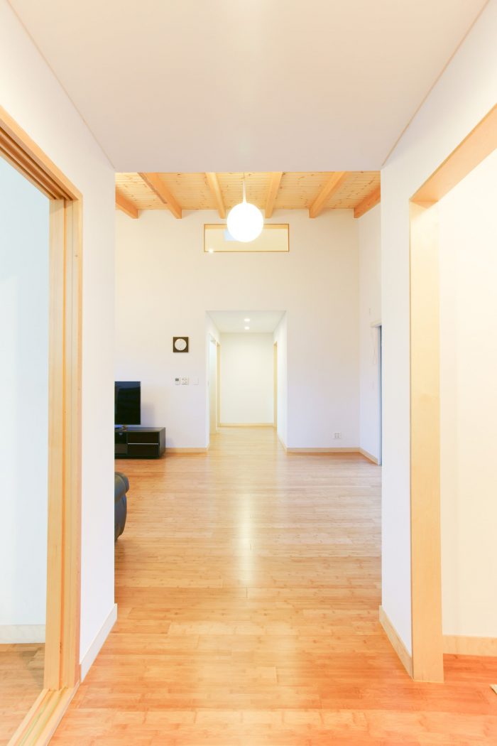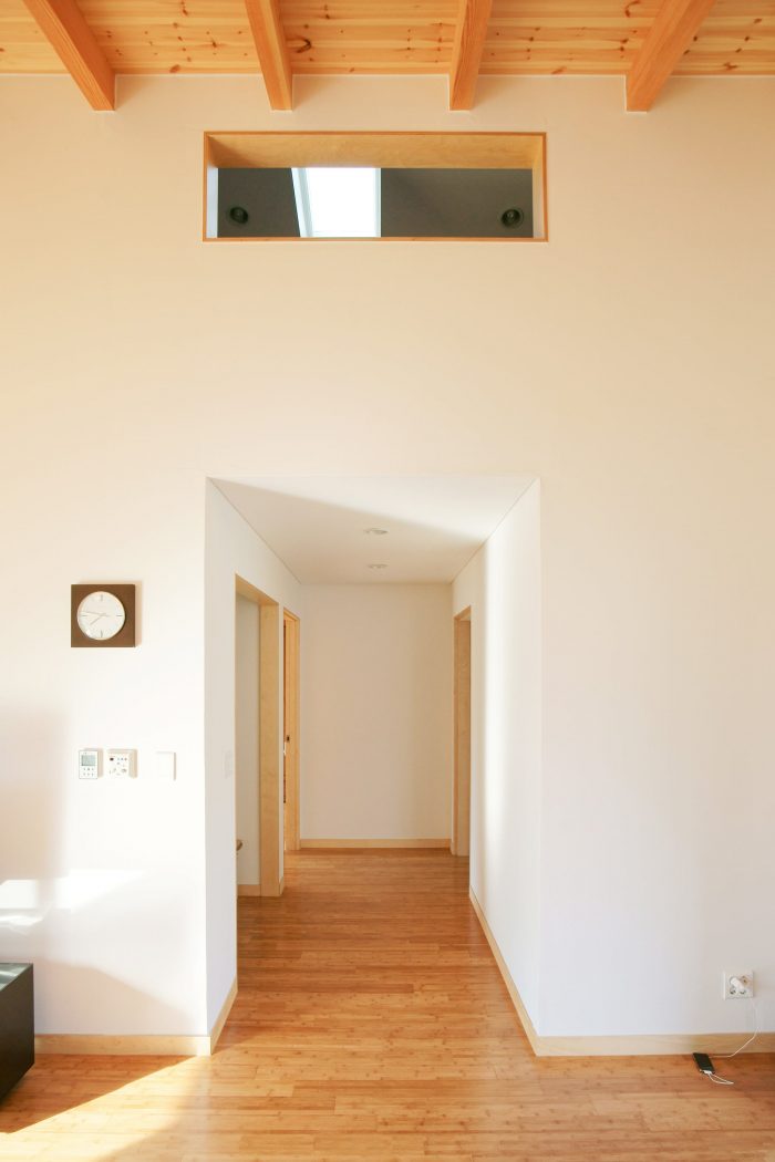 Most of relationship cannot help being parallel, because of one-story house. Thus, the living room was designed to be a central space by crossing three axes. First axis is the traversing one from main front entrance to second entrance, playing a functional role of passage. Second axis is the continuous one from front garden to Toenmaru, and to back garden deck. The building is a stationary structure, but the residences feel the outside change through the structure, and communicate with neighboring environment. The last axis is the vertical one to connect the ceiling lifted by slant roof and attic area in the roof, achieving semipublic living room and naturally ventilating at the same time.