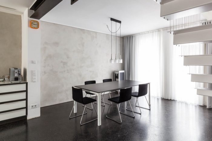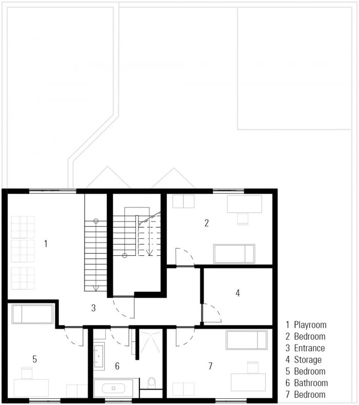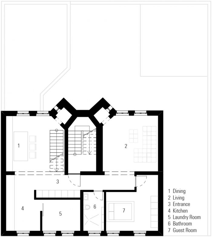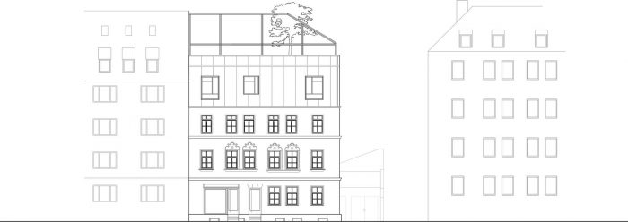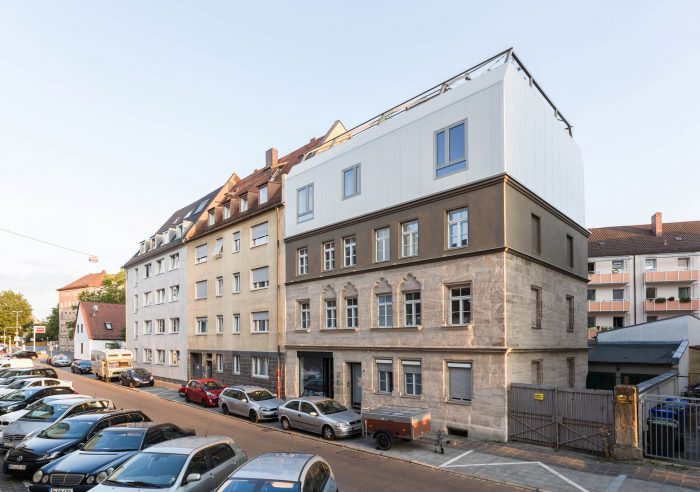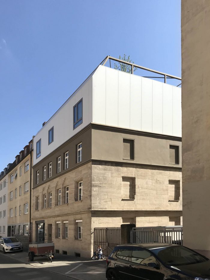 The house was acquired by a family with the purpose of extending it into a multi-use building, that includes a home for its five members, three commercial spaces, and two one-bedroom apartments. The historic districts of Nuremberg have a high urban density and it is nearly impossible to find homes with private green spaces. Thus the decision was made to take the traditional backyard and place it on the rooftop of the house.