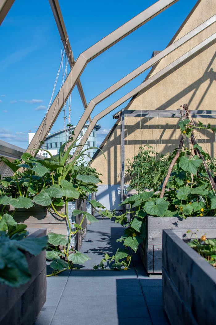 The steel structure ensures flexibility and adaptability for future uses. The plants on the roof are being watered with collected rainwater and they help reduce the carbon footprint of the building. The building is a symbiosis between organic and built structures.