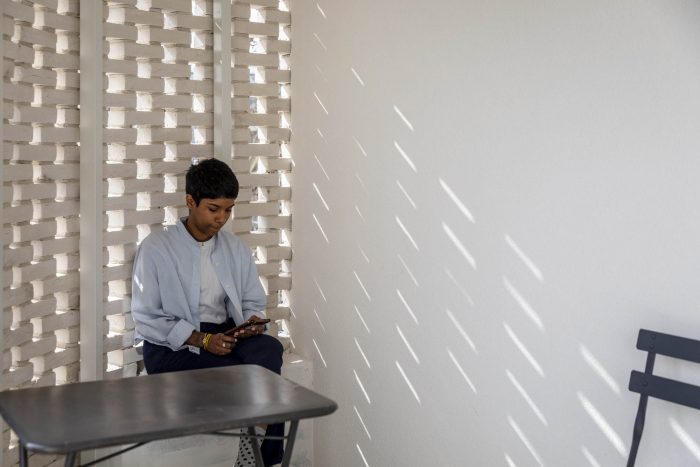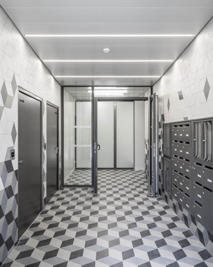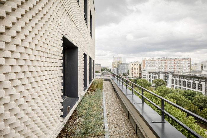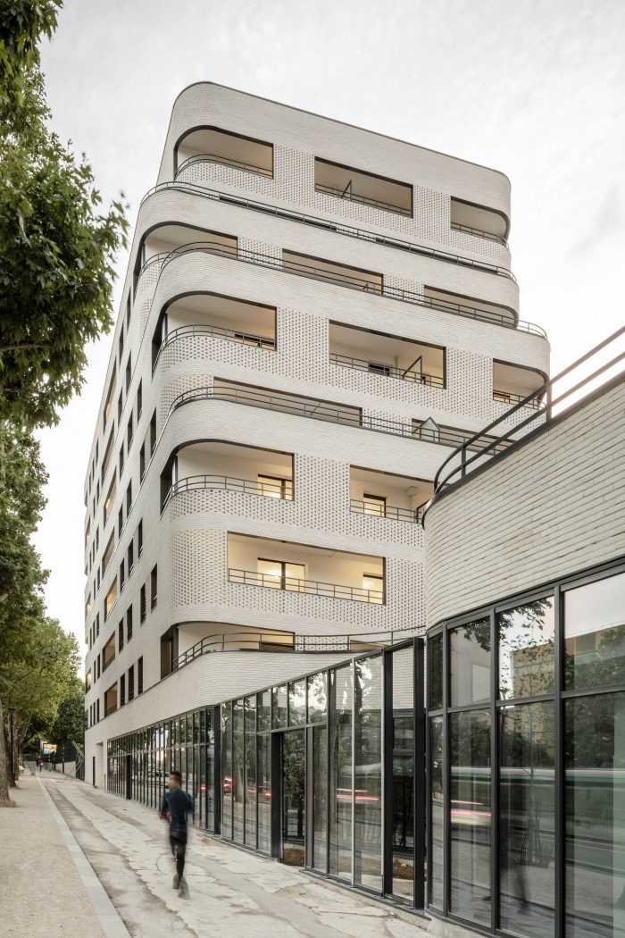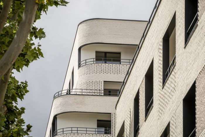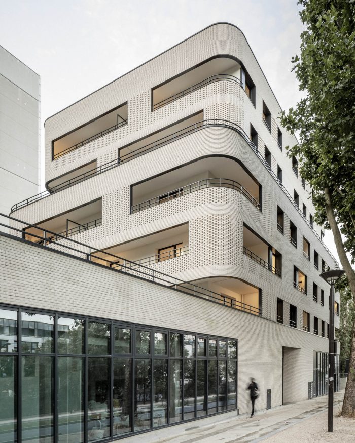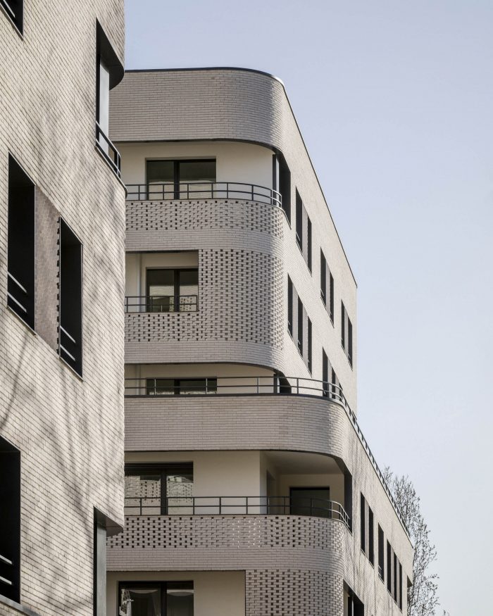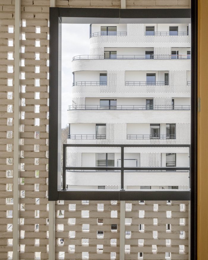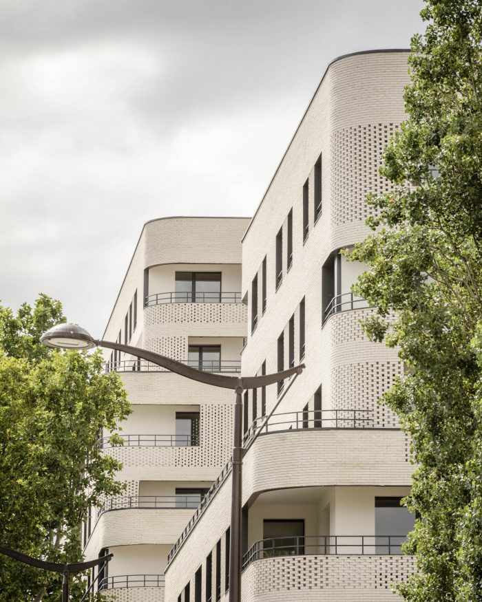 The rounded corners of the building, composed of a blend of materials enhancing light and transparency, are in contrast with the right angles of the existing towers. Series of geometric brick assemblages create a delicate pattern enlivening the façades while their corners and the guardrails of the terraces and loggias are made of an airy assemblage of brick openwork. The brick is in a dialog with the history of the social housing, while also exhibiting a highly contemporary style, owing to its white color and the outlines of the façade.