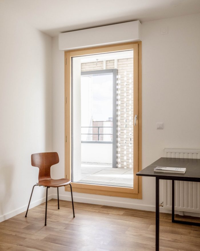 建筑的圆角,由增强光线和透明度的混合材料组成,与现有塔楼的直角形成对比。一系列的几何砖块组合创造了一个精致的图案,使立面更加生动,而它们的角落和露台及木廊的护栏是由一个空气中的砖块镂空组合而成的。砖与社会住房的历史对话,同时由于其白色和外墙的轮廓,也表现出高度的现代风格。