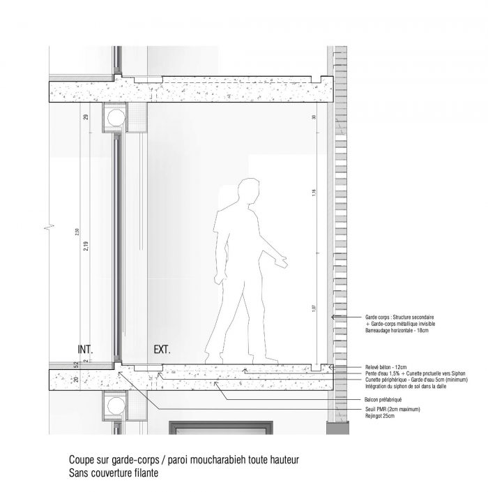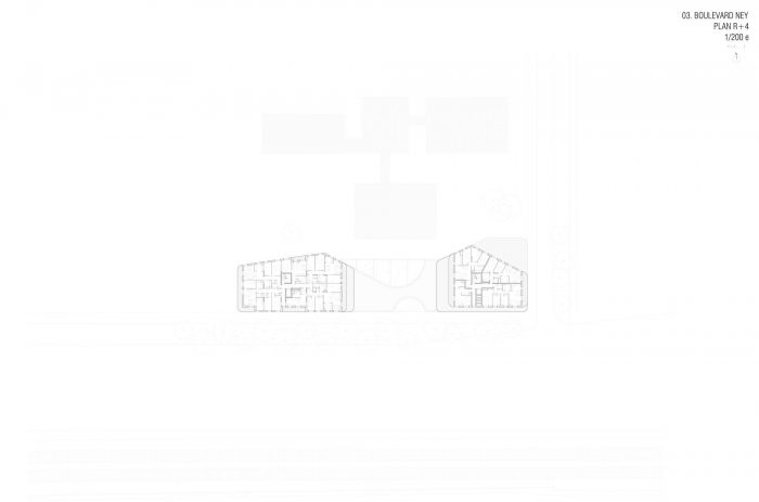 这座新建筑参与了内伊大道和克里尼昂库尔门的城市改造,被分成两个体量,底部由一个共享平台连接,由幼儿园占据。在这里,自70年代以来已经存在的地段的这种密集化使建筑部分与林荫道保持一致,使其成为一个更紧密和更活跃的地方。