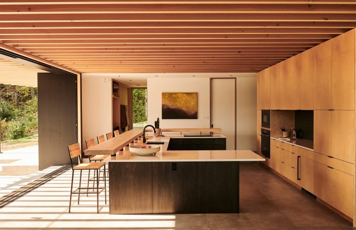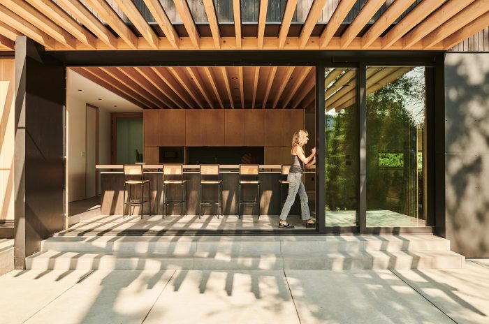 Cantilevering the home over the rock face heightened the sensation of floating above the lake while framing views. Inspired by the notion of visually dissolving the home into the landscape, we used dark-stained Western red cedar siding and fiber cement panels to encourage light and shadow to blur the line between the built structure and the natural world. Emerging from the structure supporting the home’s lofted bedrooms, a trellis made of Douglas fir beams guides the arrival sequence and introduces lake views. The kitchen is a social heart, where family cooking seamlessly transitions to outdoor dining.