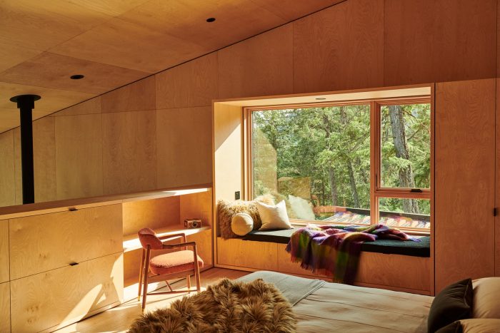A stair outside the home’s main volume leads to two bedrooms and bathrooms in a loft, with an additional bunk room tucked above and accessed by a ladder. While primarily intended for summer use, an energy-efficient fireplace and heating system, and continuous exterior insulation, provide ample comfort in cold weather. During warm summer months, large operable windows and doors in the living area, kitchen, and bedrooms allow natural ventilation throughout.