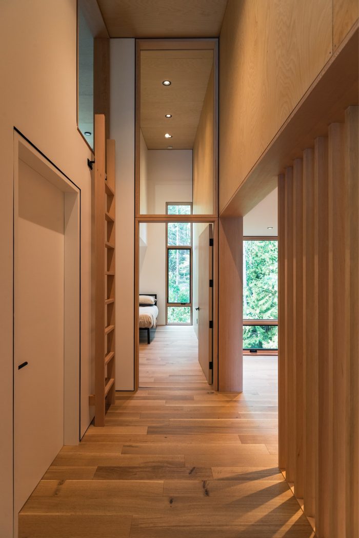 On an initial visit, we explored the sloping hillside, where Douglas fir, cedar, and pine gave way to a rocky overlook. Embracing the sensation of floating in the forest, we designed a cabin that cantilevers over the outcropping and follows the landscape in its wedge-like form. The 2,500-square-foot home celebrates the exhilaration of its surroundings and the communal nature of lakeside gatherings.