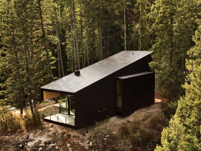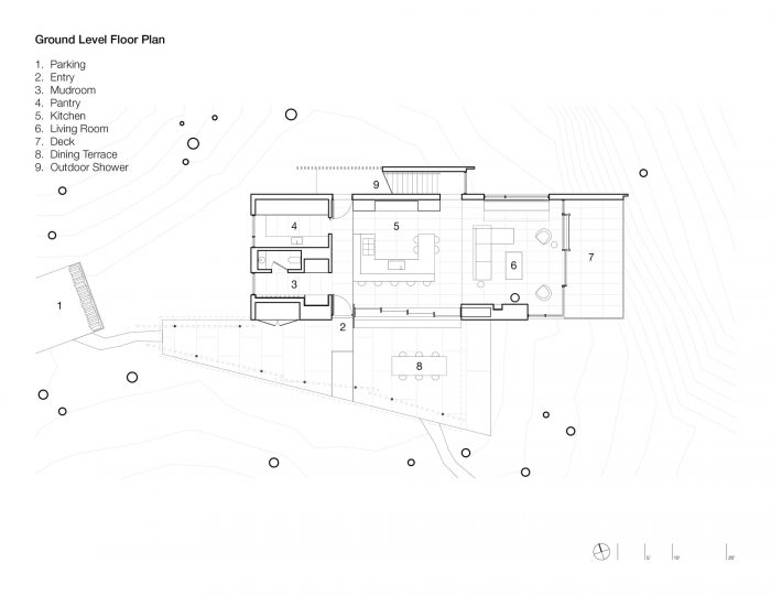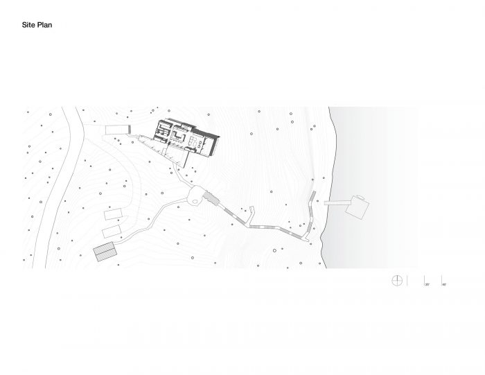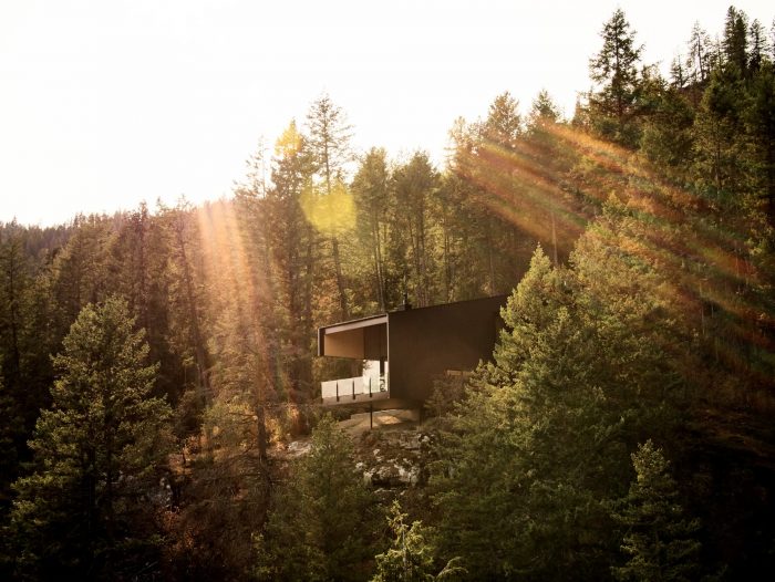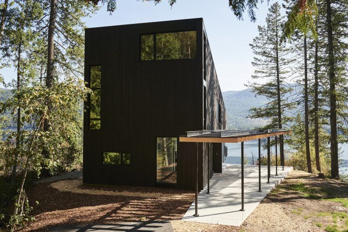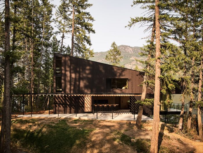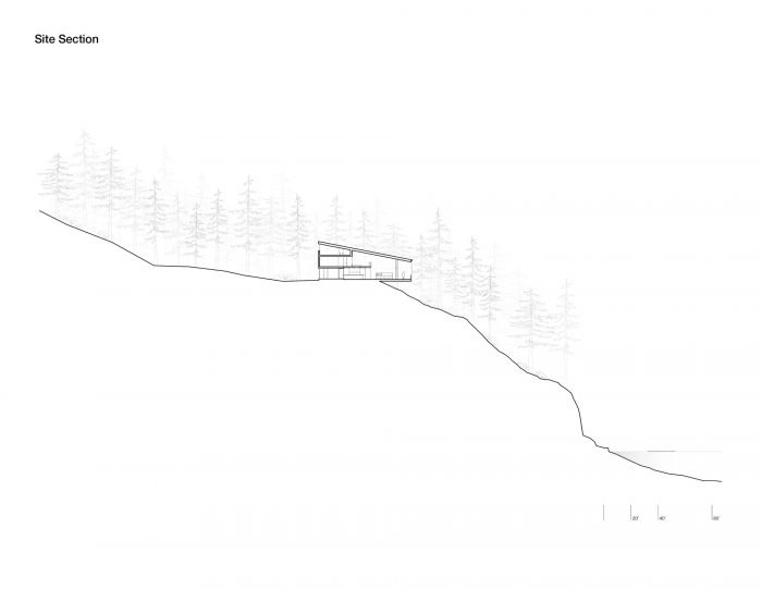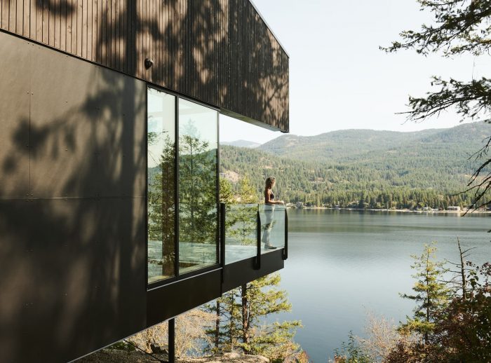 悬臂式的房屋在岩壁上,增强了漂浮在湖面上的感觉,同时也使景色更加优美。在视觉上将房屋溶入景观的概念的启发下,我们使用了深色的西部红雪松护墙板和纤维水泥板,以鼓励光和影,模糊了建筑结构和自然世界之间的界限。从支撑住宅阁楼卧室的结构中走出来,一个由花旗松梁制成的棚架引导着到达顺序,并引入了湖景。厨房是一个社交中心,家庭烹饪在这里无缝过渡到户外用餐。