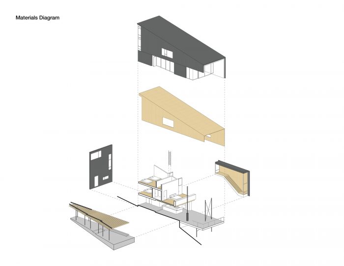 我们用预处理的桦木胶合板包裹了充满阳光的大房间,提升了一种不起眼的材料,以提供温暖和一个轻松的框架。通过沿着甲板雕刻部分外墙,我们将湖的南部曲线带入视野,创造了一个全景式的有利位置。窗墙处细长的钢横撑提供了所需的刚度和剪切力,同时保留了视野。