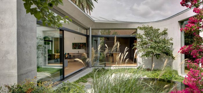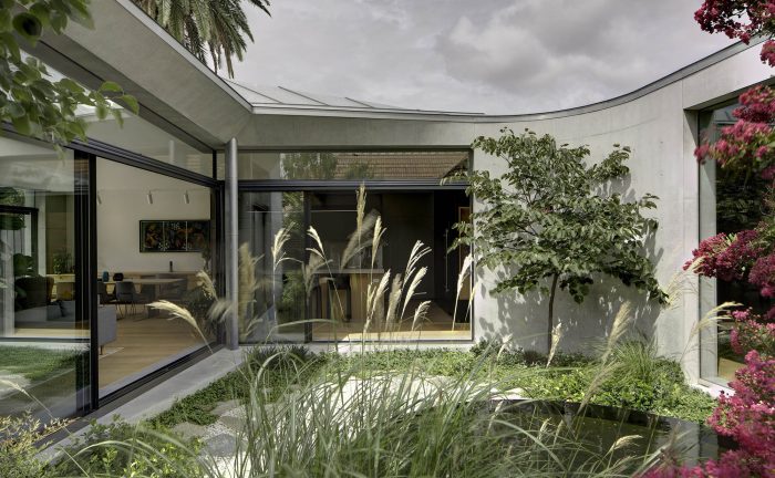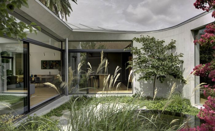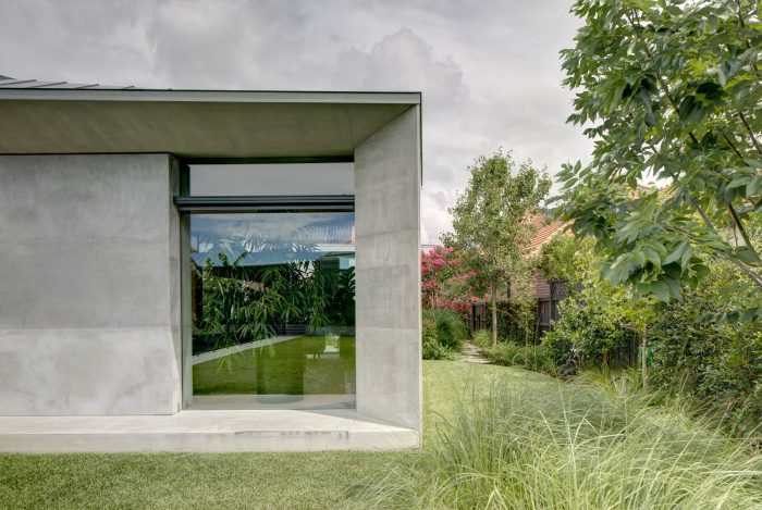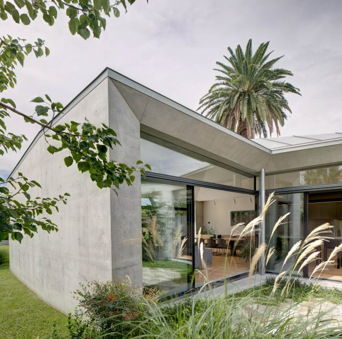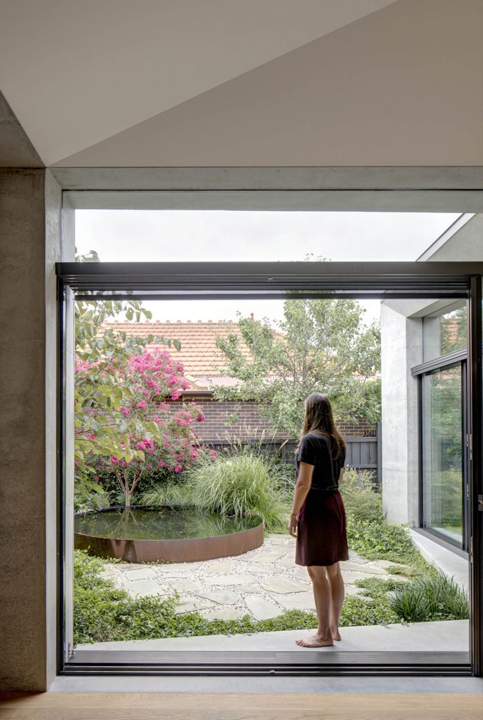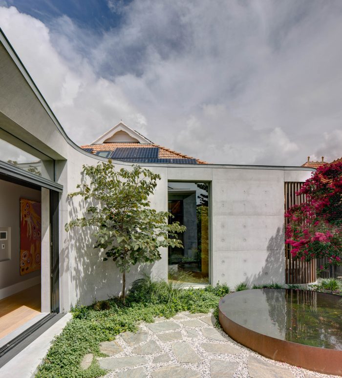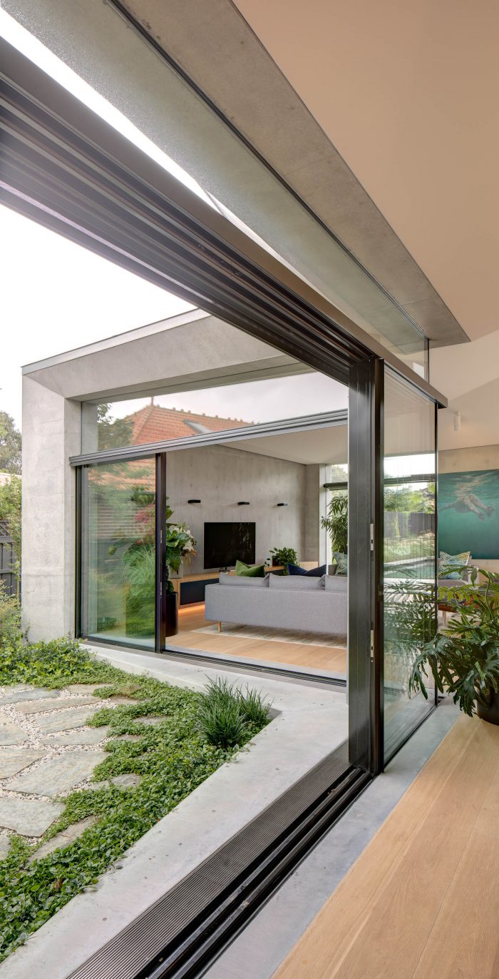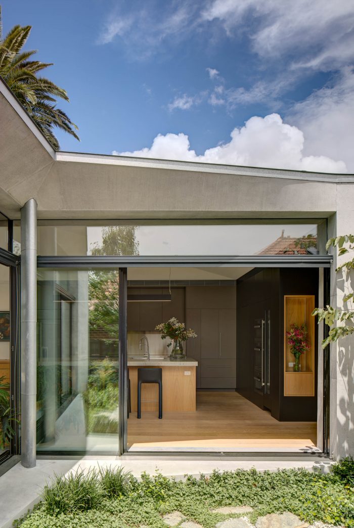 The new, concrete, glass and zinc addition scoops and leans into the northern courtyard and rear garden. The defining gesture of the rear addition is this courtyard which breaks up the long volume of the house and extends to form a sculpted second entry which peeks out to the street from behind the original brickwork.