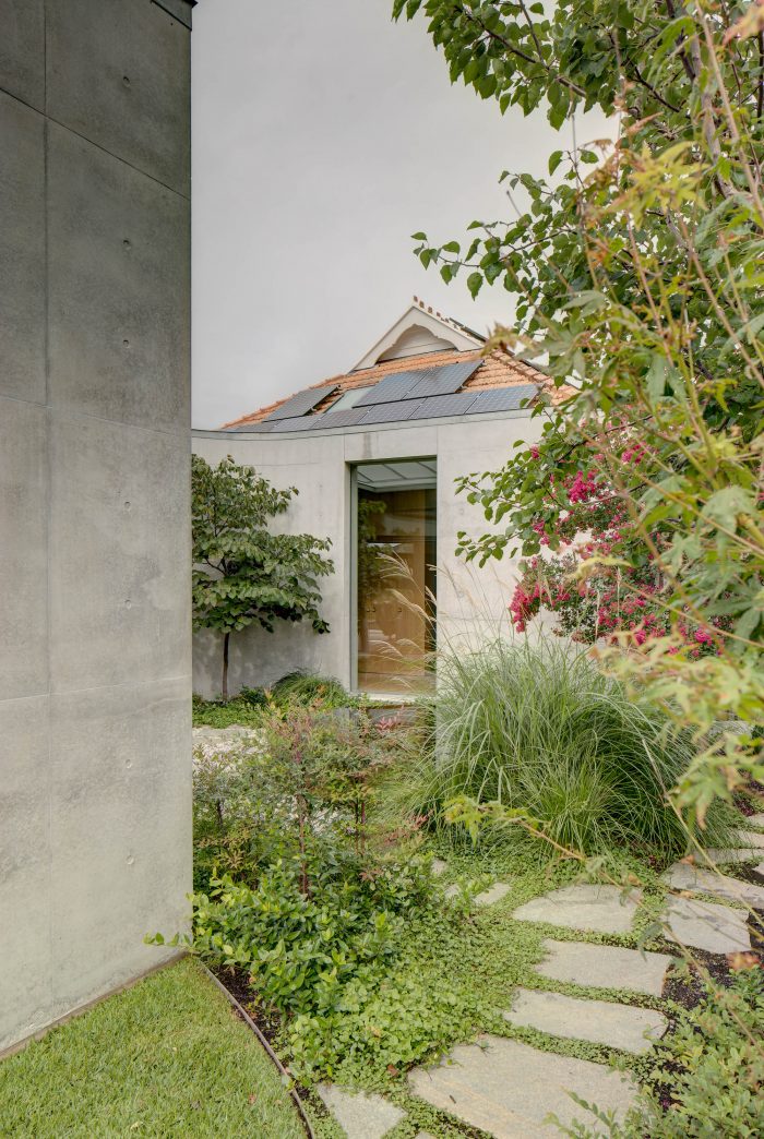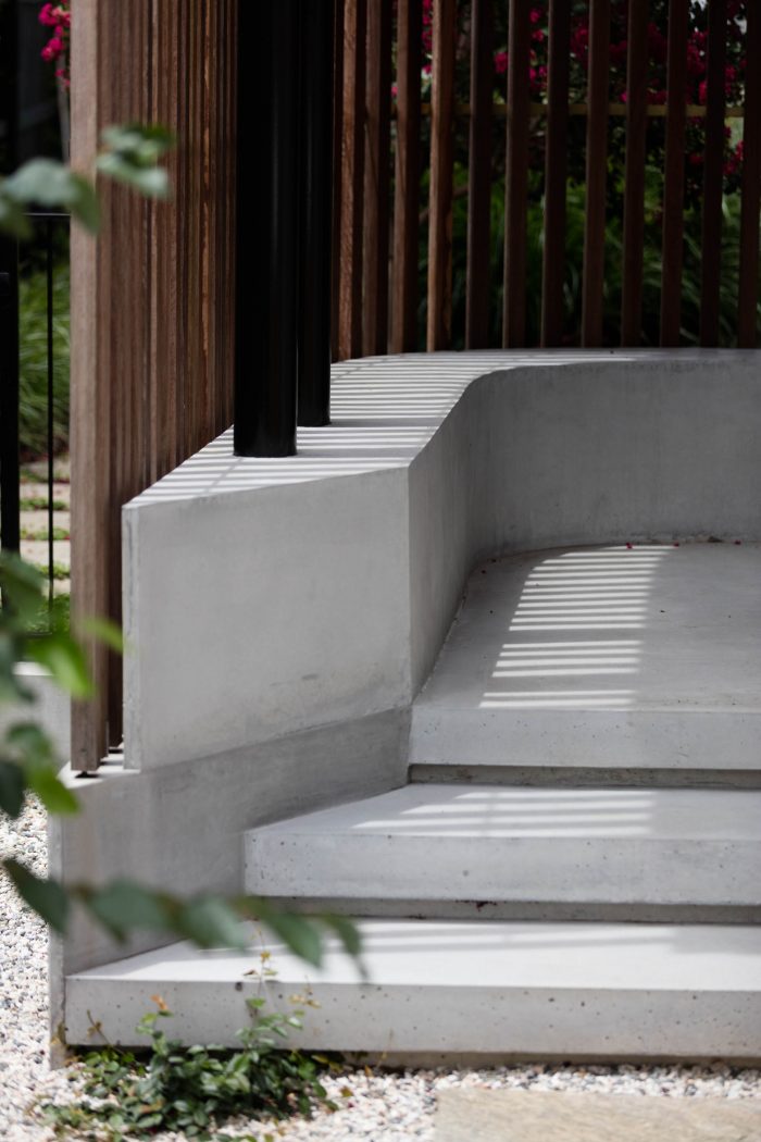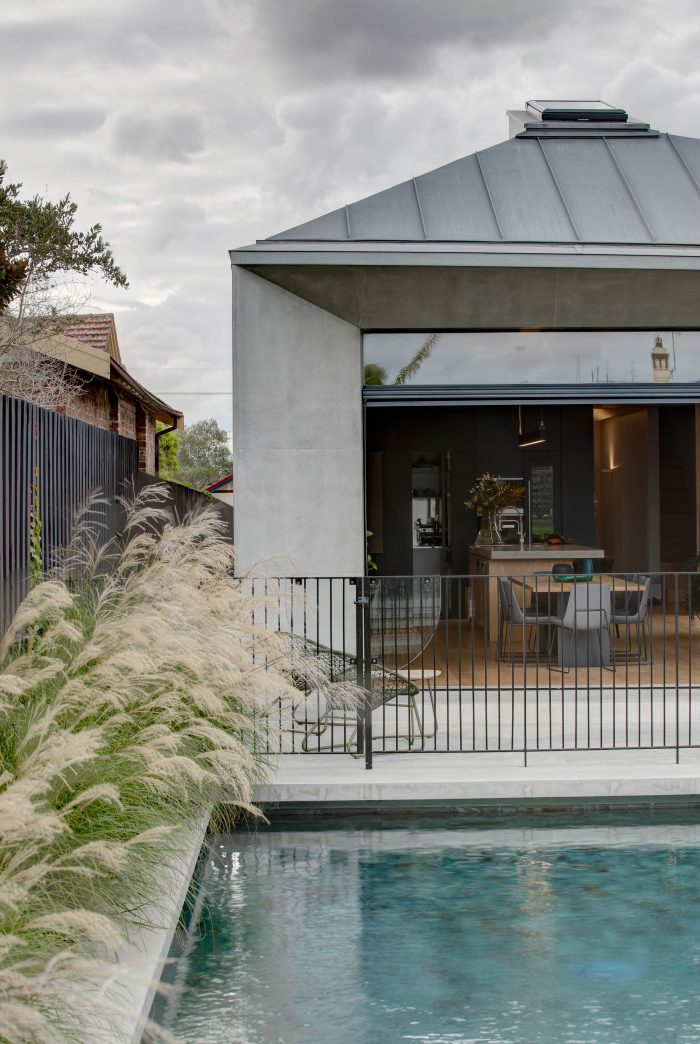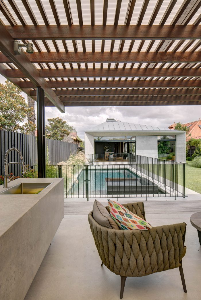 混凝土的优雅曲线从原建筑中穿过,展现在人们面前的是一个引人注目的庭院花园和后方的扩建部分。在这个非常大的街区的角落里,一个低矮的车库被改造成了一个拱形的小木屋空间,创造了一个宁静的休息场所和毗邻游泳池的娱乐区。