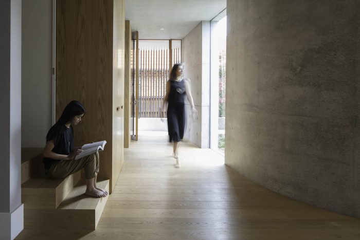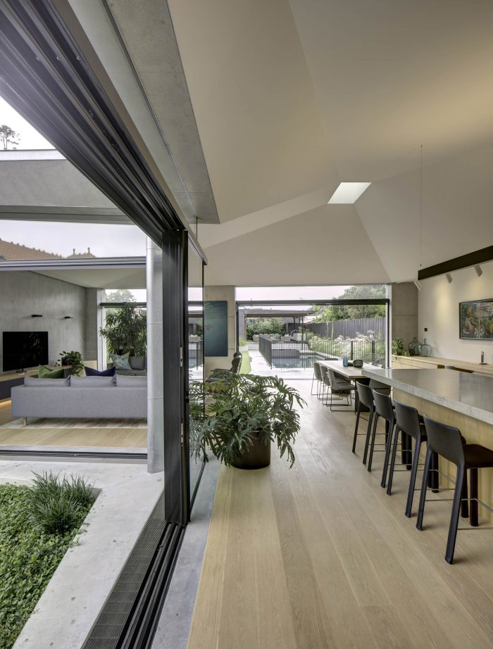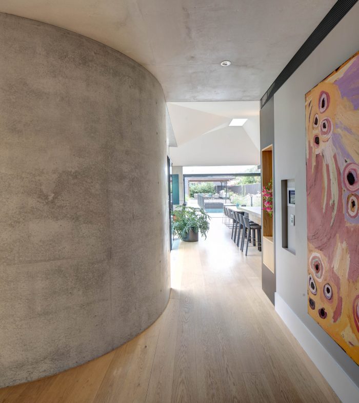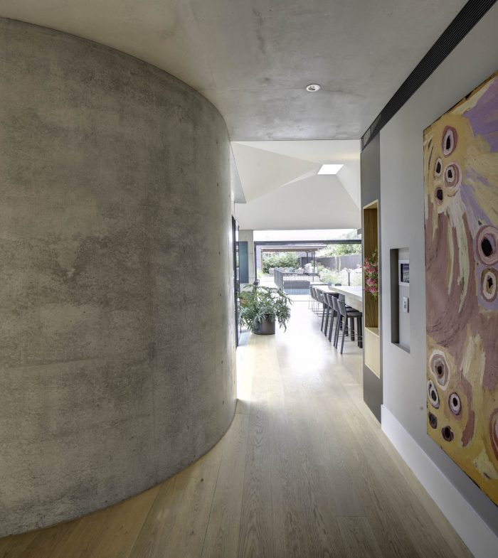 This second entry anticipates the daily comings and goings of the family of six, with nooks to conceal school bags and sports gear. A monolithic curved concrete wall defines the passageway into the expansive light-filled kitchen, dining and living space.