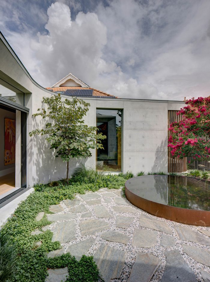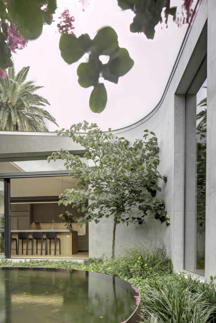 Graceful curves of off-form concrete are revealed in views through and past the original building, opening to a striking courtyard garden and extension to the rear. A low-ceilinged garage in the corner of the very large block has been converted into a vaulted cabana space, creating a peaceful retreat and recreation area adjacent to the pool.