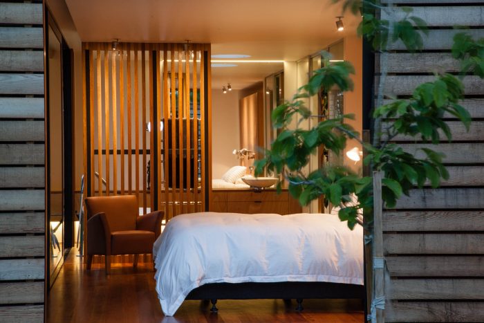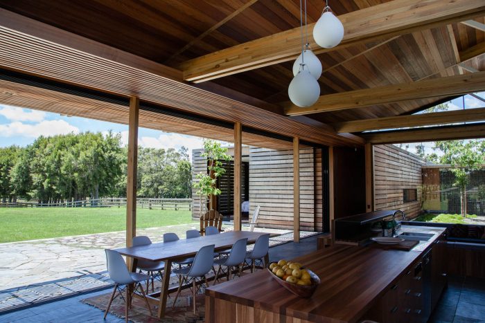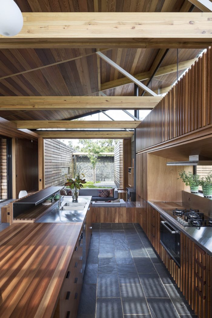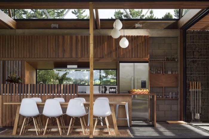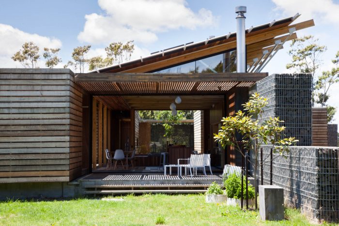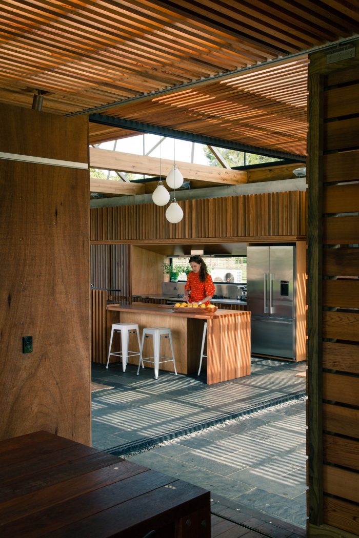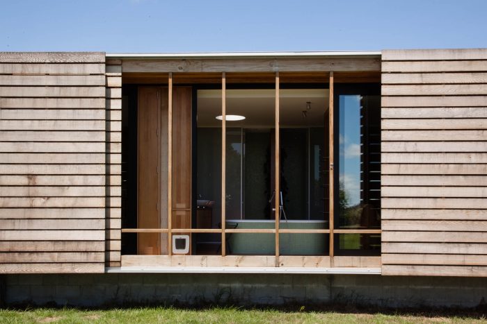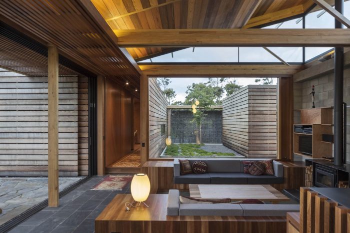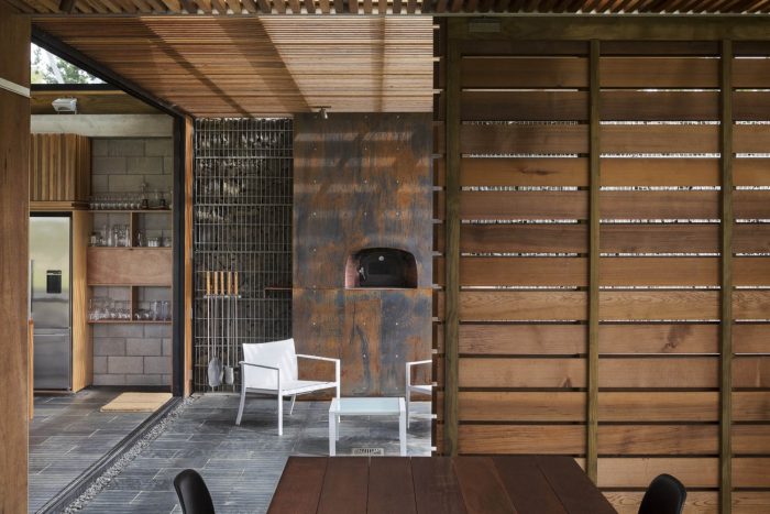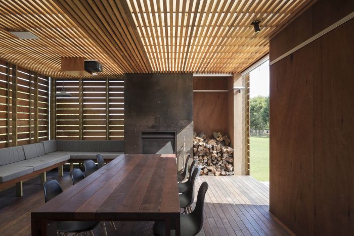 The house has 3 positive elements with negative spaces between. These positive elements house the Lania, the garage and the bedrooms. They are articulated as simple box forms with weathered timber planked skins referencing agrarian crates. The giant crates form the edges to the negative spaces and frame views of the site.