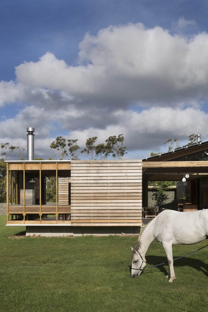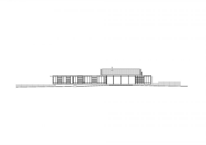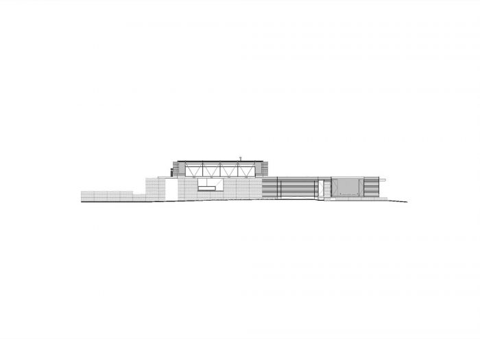 房子被抬高在一个砌块基座上,以使其脱离潜在的潮湿的同质土地。这个高度使箱子可以打理,使居住者可以看到葡萄园,并使他们更接近骑手的眼睛高度。基座与石笼网相交,并以石笼网为边沿,使正负空间失明。
