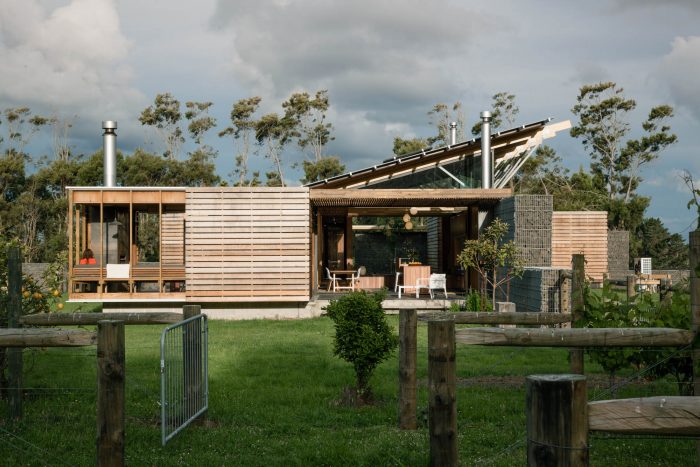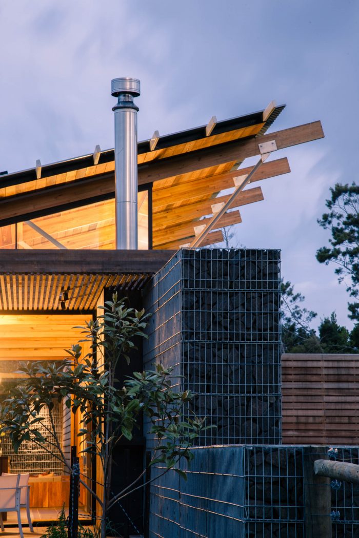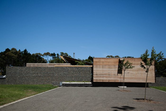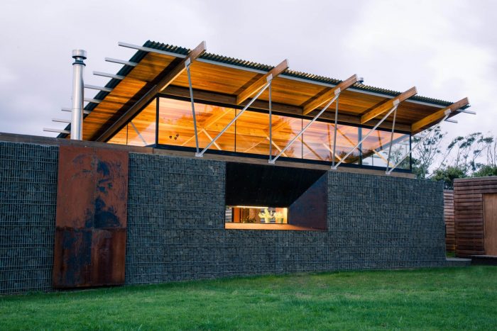 The gabion basket walls start low demarcating entry points and rise up to form the anchor wall of the house.